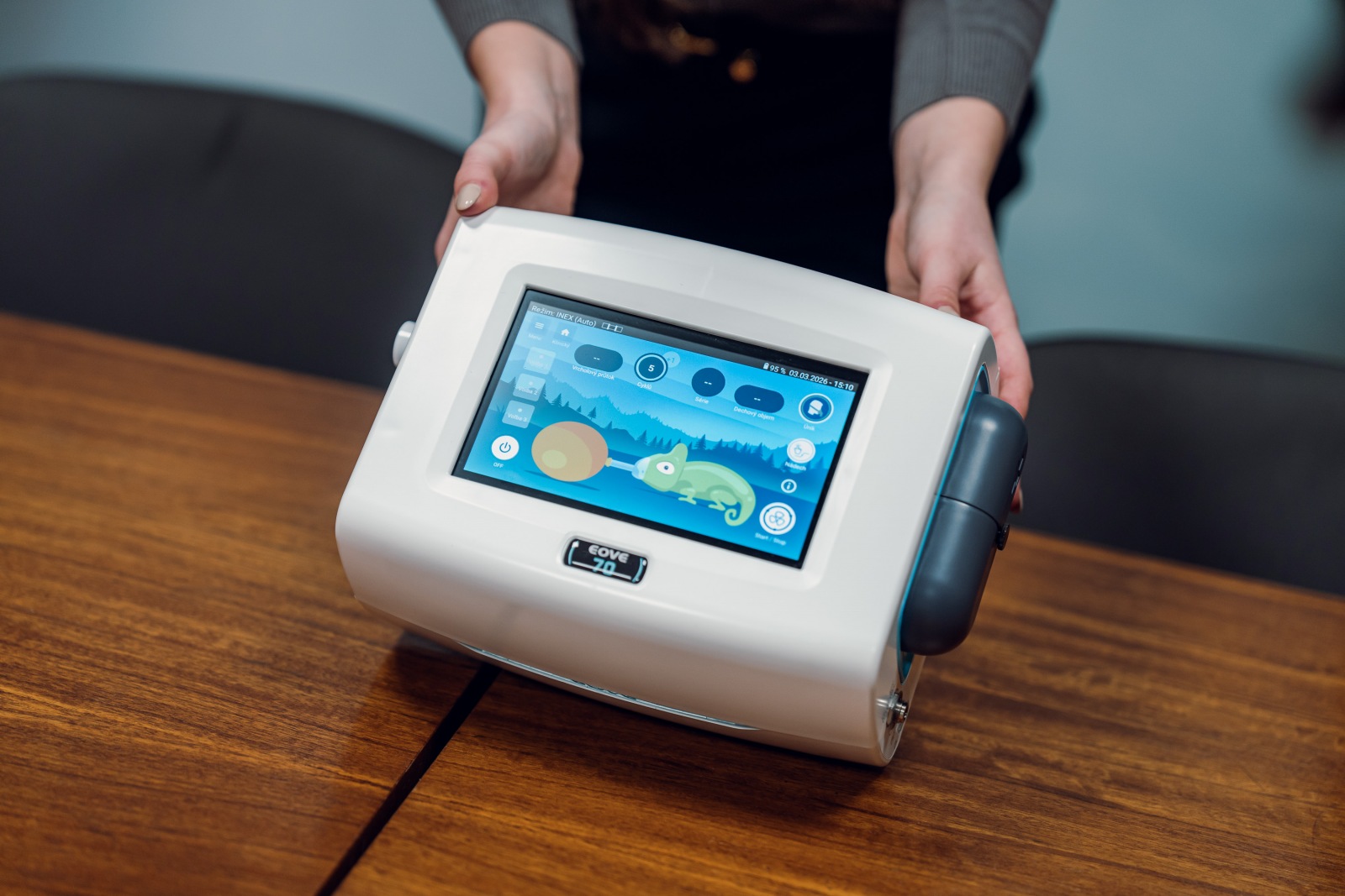 Po konzultaci s dětským oddělením FN Bulovka byl vybrán konkrétní model EOVE EO-70, který je vhodný právě pro pediatrické použití, protože model nabízí přívětivou, hravou grafiku, která pomáhá snižovat stres malých pacientů během terapie a podporuje jejich lepší spolupráci při léčbě. Na místě jsme si také ukázali, jak nový přírůstek do nemocničního vybavení vůbec funguje.