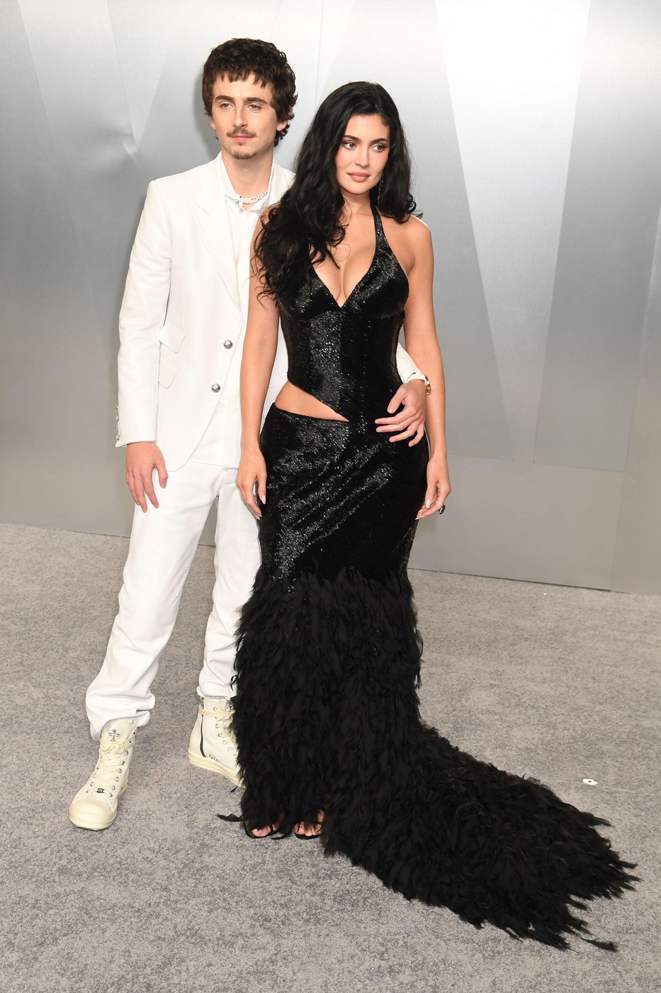 Timothée Chalamet zvolil úplný opak. Bílý oblek působí svěže a uvolněně, ale zároveň trochu rozbíjí formálnost celé události. Boty a ležérní styling dávají outfitu nádech rebela, který si jede podle vlastních pravidel. Vedle Kylie tak tvoří zajímavý kontrast – ona dokonale upravená diva, on nenucený a trochu nezkrotný. Dohromady jim to ale funguje.