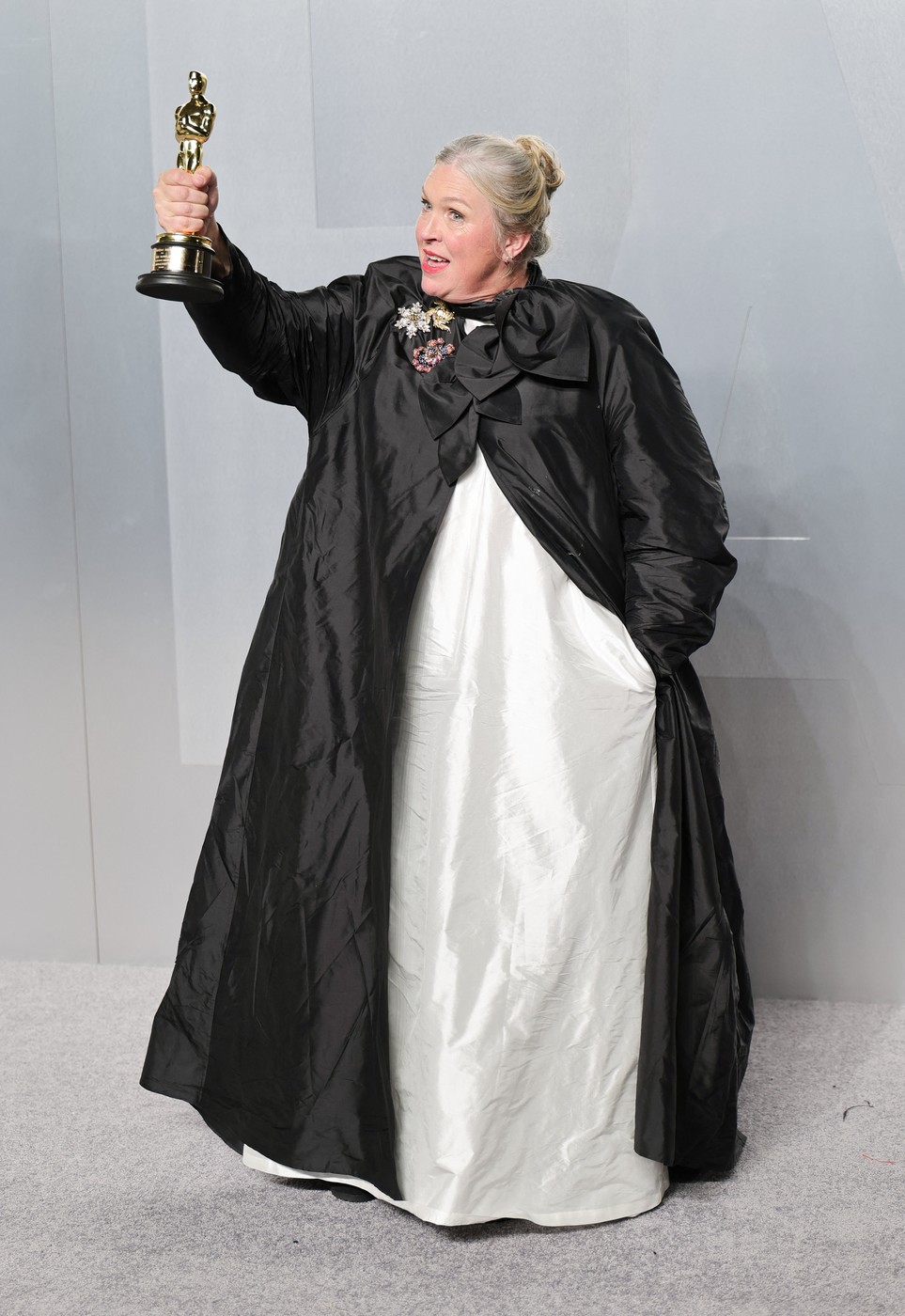 Novozélandská scénografka Kate Hawley rozhodně nezapadla. A to byl nejspíš záměr. Výrazný černý plášť v kombinaci s jednoduchými bílými šaty působí jako silné vizuální gesto, ale celek je těžký a málo lichotivý. Materiál připomíná spíš technickou látku než večerní róbu a zbytečně ubírá na noblese, kterou by taková událost měla mít.