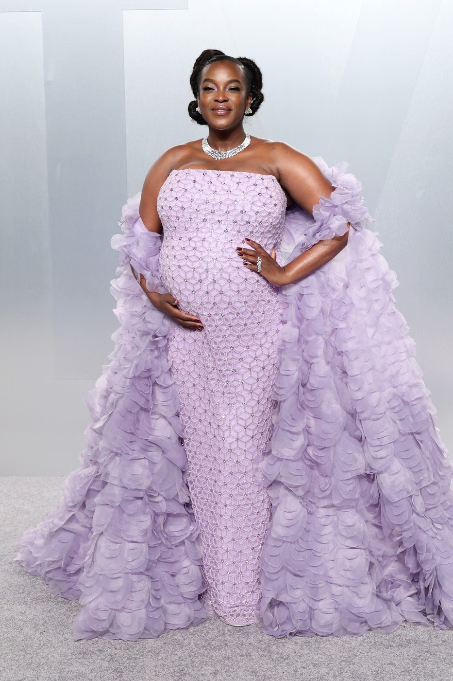 Herečka Wunmi Mosaku zvolila jemnou levandulovou róbu, která na první pohled působí romanticky a slavnostně. Střih krásně zvýrazňuje těhotenské bříško a celek působí něžně a žensky. To je rozhodně plus a funguje to. Hvězda ze seriálu Temný pasažér prožívá jedno z nejkrásnějších období svého života a je vidět, že doslova září.