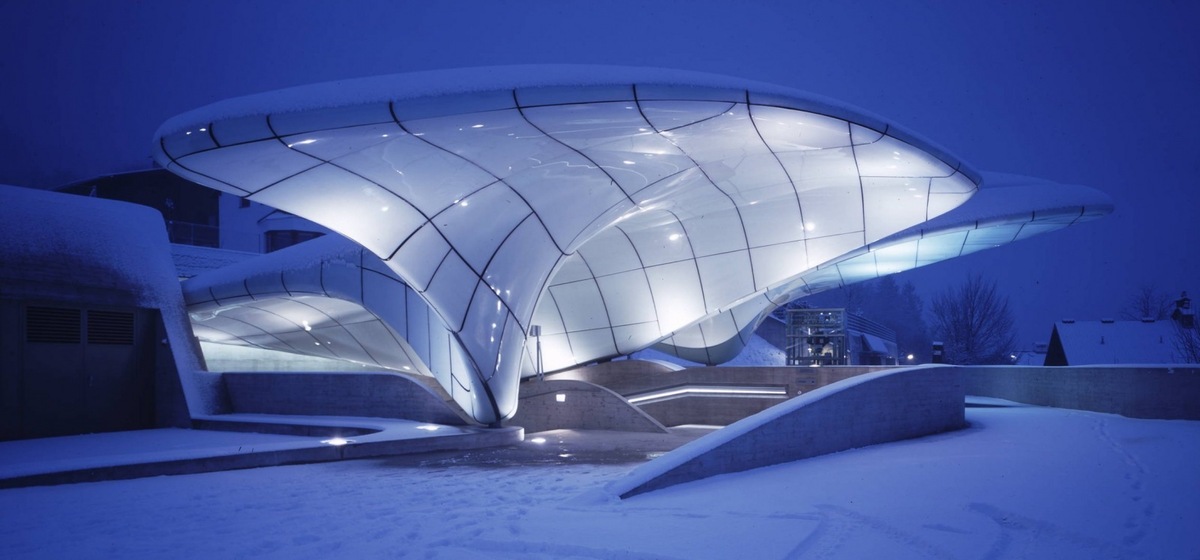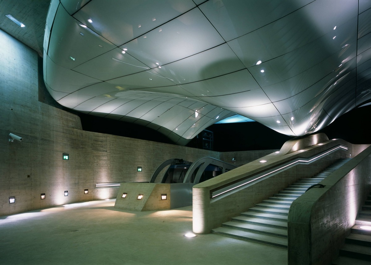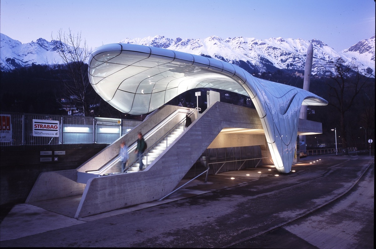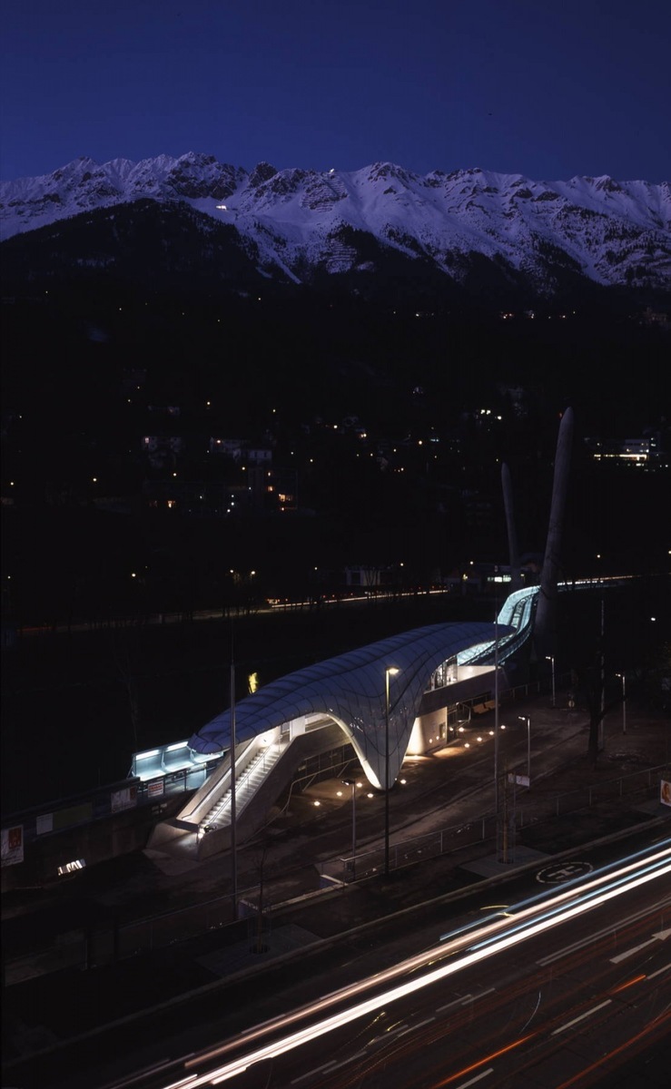 Hungerburgbahn – a station inspired by glaciers, plays an important role for passenger thoroughfare, transit between the connecting stations from central Innsbruck to Nordkette Mountain or Hungerburg, but it also symbolises the alpine character of the city. All four stations create an angular geometry that is so characteristic of the architect. Every part was designed and adapted to correspond to one unique context, topography, altitude and current of passengers.