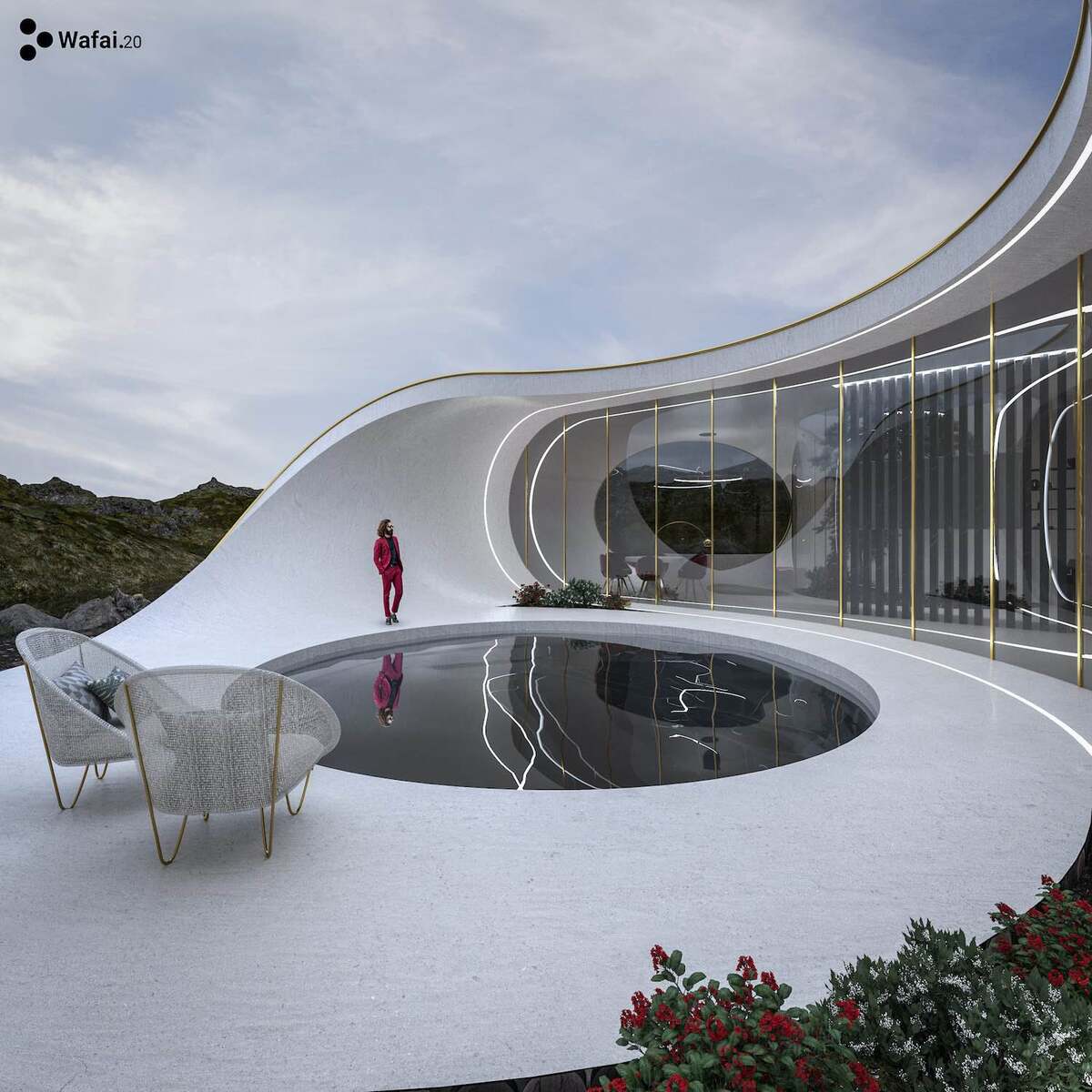 The interior of the house is characterized by a minimalist color design and generous size. You won't suffer from claustrophobia here. In fact, you'll be surprised how much the architect managed to fit in! The one-storey house is basically composed of three parts. The living area includes a kitchen, a dining area and a living room. What shouldn't escape your attention in this area is the grand sofa facing a large circular window. Just imagine yourself resting here with a cup of your favorite café in your hand, watching the life outside. What a nice mental picture, right? Suddenly, you wish you could stop the time. Next comes the sleeping area, two bedrooms and a bathroom. The last part is the outdoor area, which is complemented by a swimming pool and a relaxation zone.