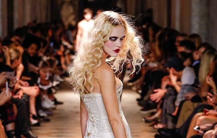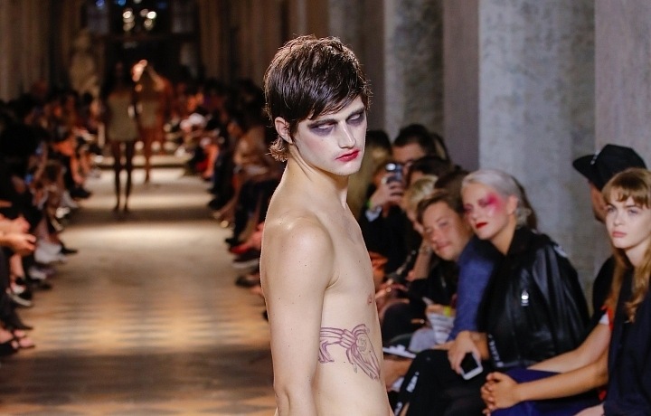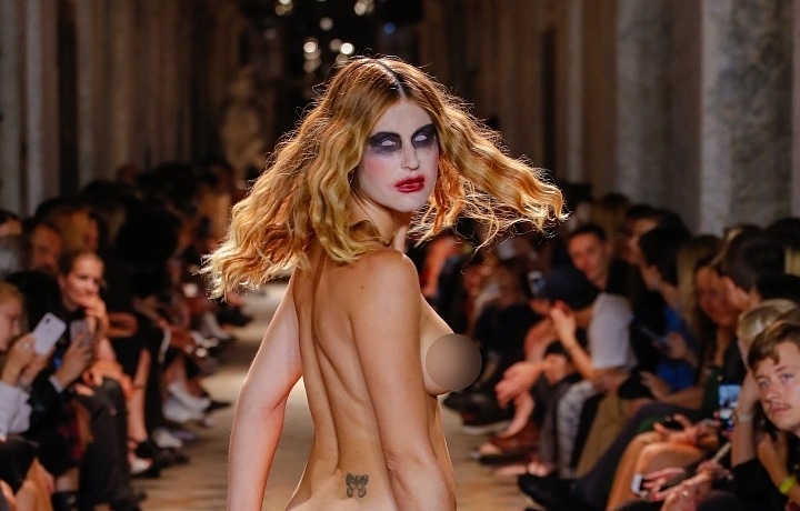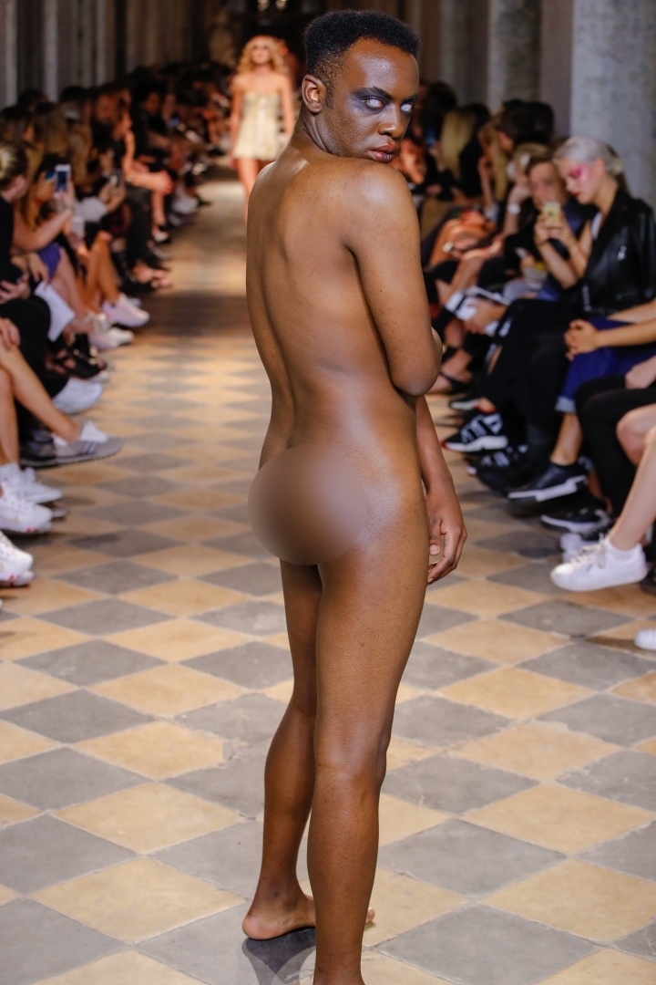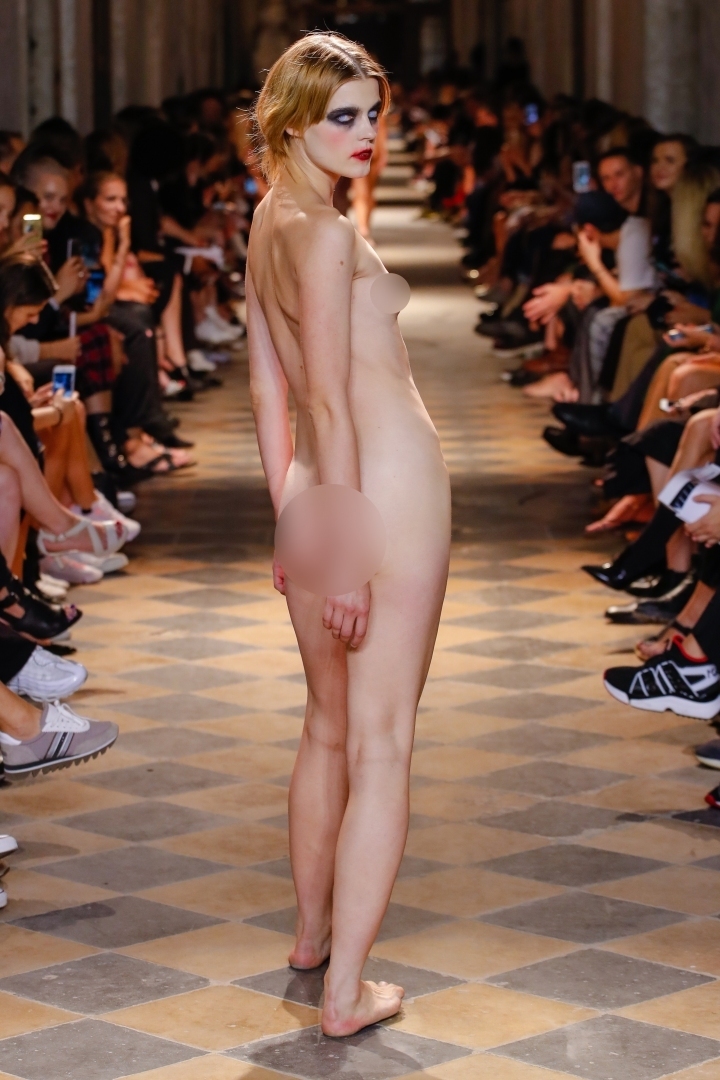 We haven't seen this yet at MBPFW! A fashion show that overall presented 3 skirts, 2 corsets and an overabundance of naked bodies shocked us. What are we actually supposed to take away from it? The idea that fashion is overrated? That we¨re wasting clothing? Perhaps. But we'd have still expected a bit of a different, less creepy concept for a brand trying to find balance among extreme contrasts.