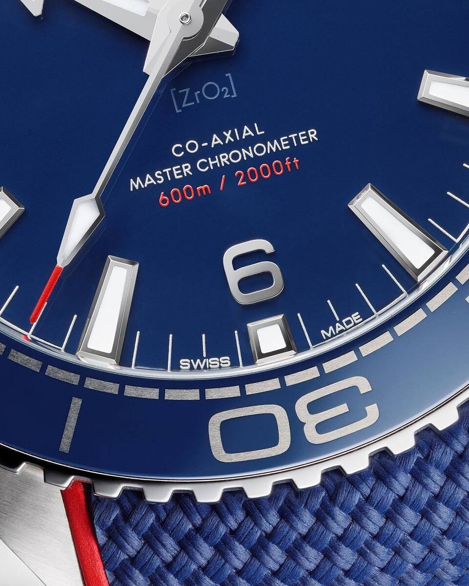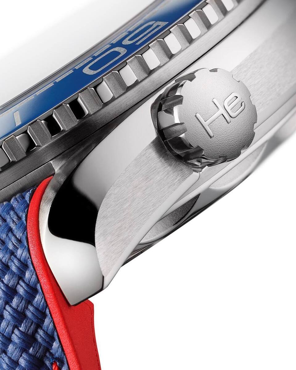 This at first glance sporty piece of 43.5 mm in diameter was created with the use of colours of the South Korean flag. The watch has, similarly to the model AQUA TERRA a blue ceramic dial, but compared to the first model this is combined with red in the first 15 minutes. Also, the combination of red and blue is then also present in the rubber strap.
