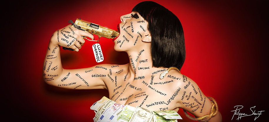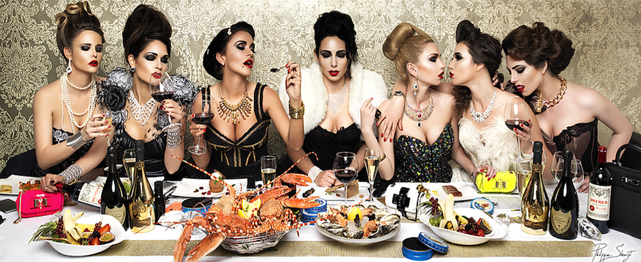 And now, on to luxury. His last series of paintings (2015) was entitled “Luxury Overdose”, which literally overflowed with beauty and an was filled with an excess of just about anything you can imagine that might be considered a "luxury". For example, the painting "Luxury Overdose Dinner" takes the viewer into a dream world for many. There are diamonds, gold, jewelry and other outrageously expensive and inaccessible things. One just needs to reach out and touch them.
