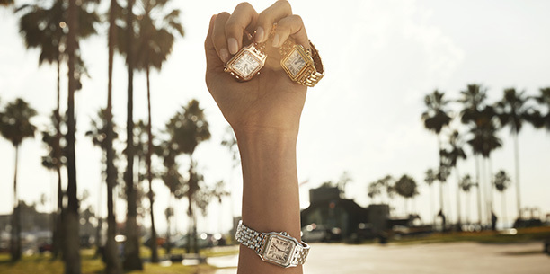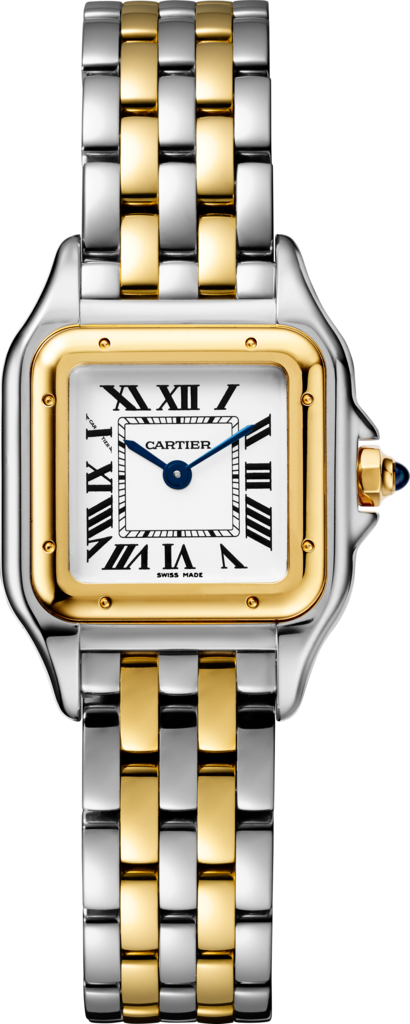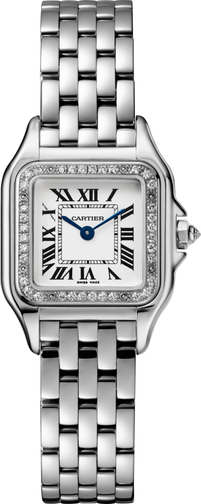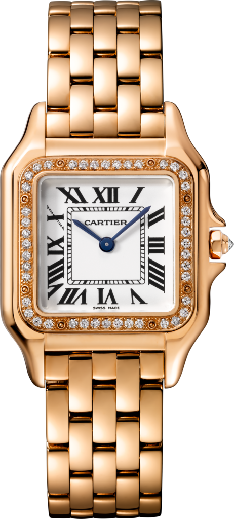 Ladies’ wristwatches in the Panthère de Cartier 2017 collection are available in the following materials: yellow gold, pink gold, pink gold with a diamond bezel, white gold with a diamond bezel, white gold covered in diamonds, white gold with diamonds and black enamelled animal footprints, steel and yellow gold, pure steel and a limited edition in pink gold with black lacquered lines.