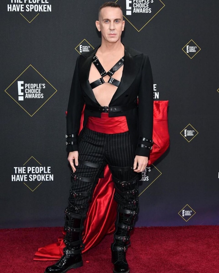 Designer Jeremy Scott looked like he'd just run off to the awards from a fetish club next door. His bare chest with straps, a red train and something that could be dubbed footwear pose a number of questions. But the designer himself likely doesn't know the answers to those...
