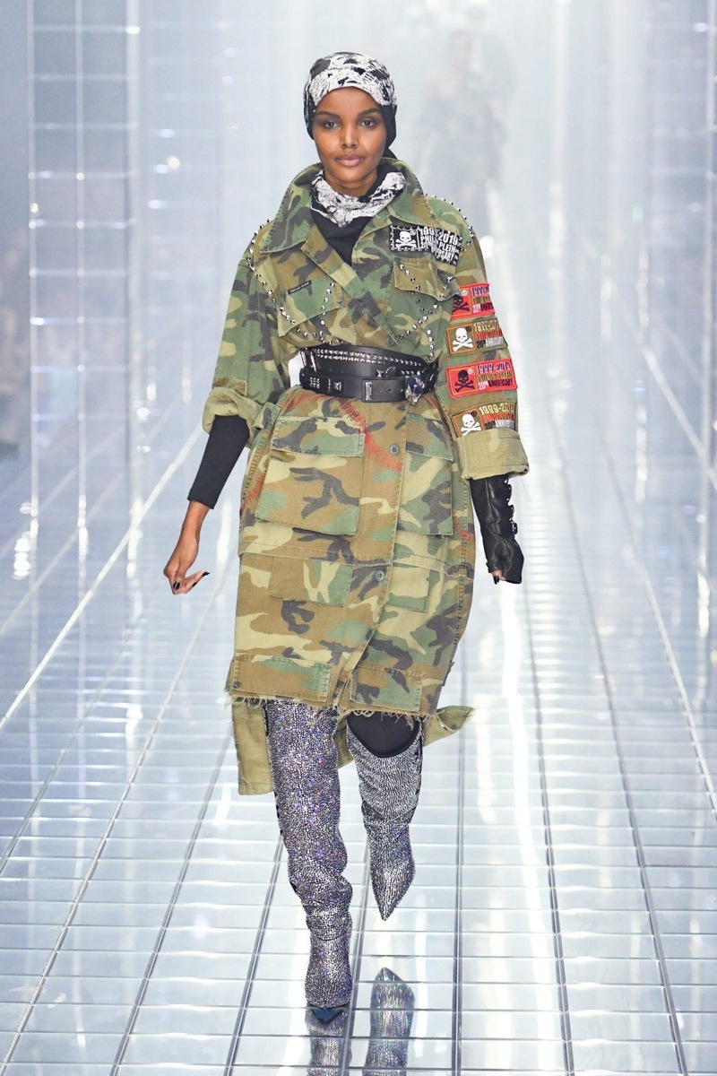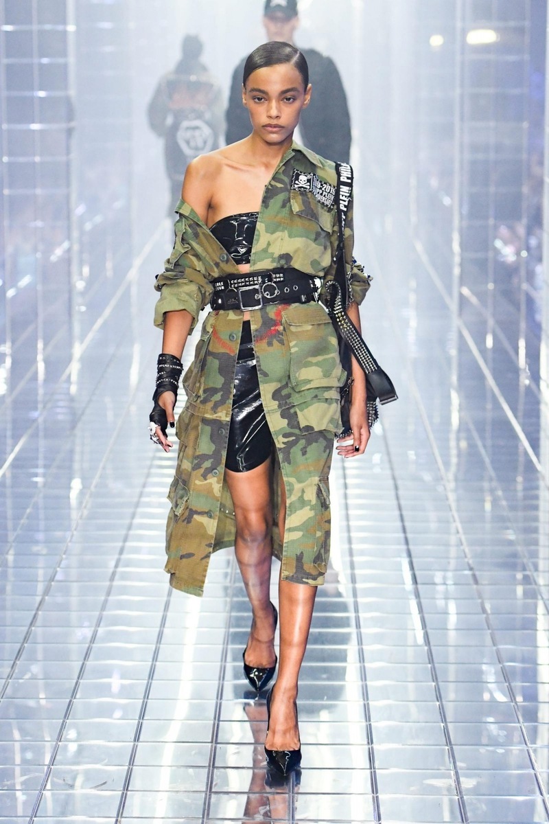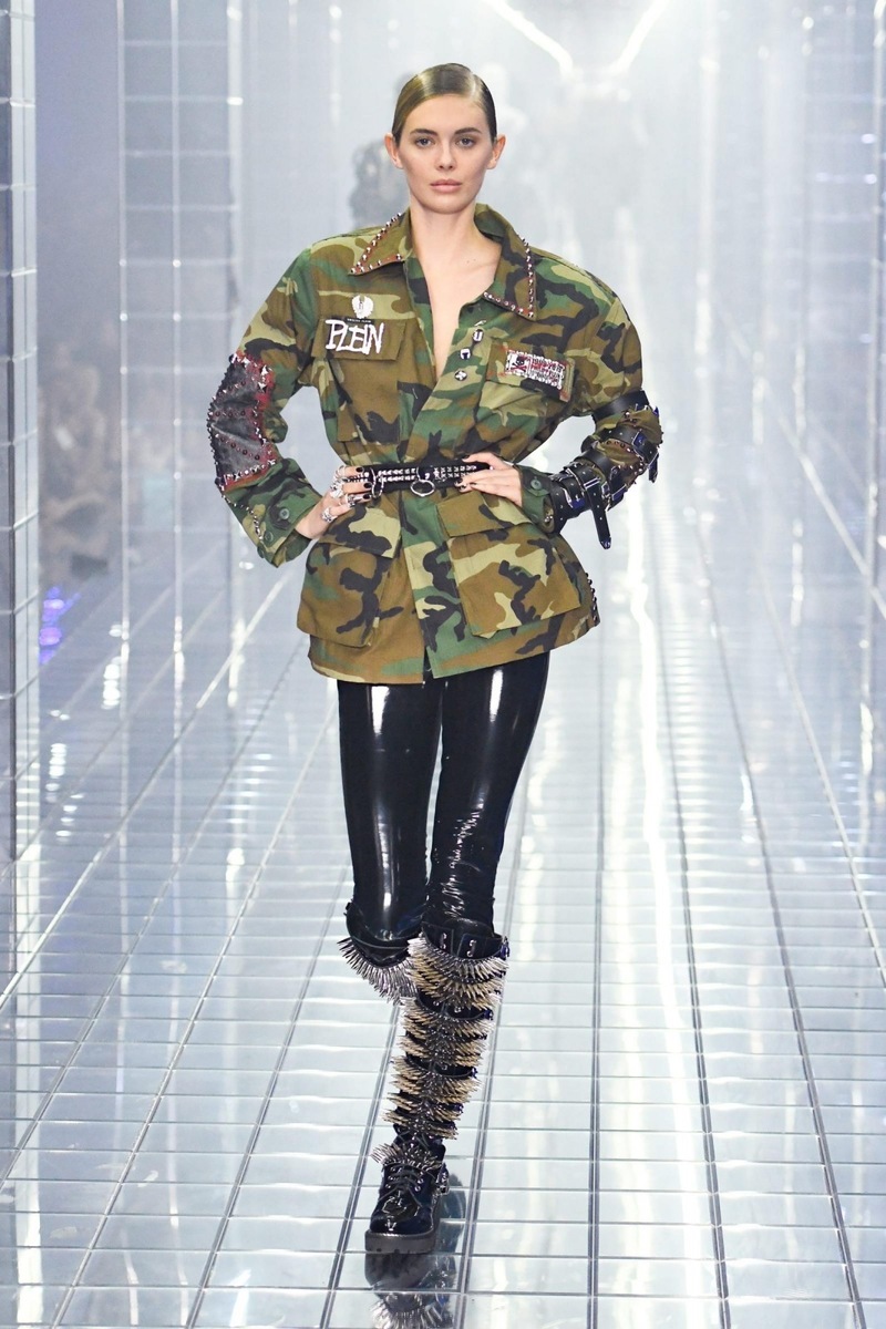 As regards the question of patterns, Philipp Plein reached for camouflage, which in combination with the novel materials created luxury models in the style of army & rock'n'roll. Camouflage fabric adorns jackets as well as overcoats and brings a little relaxation from the ubiquitous leather.