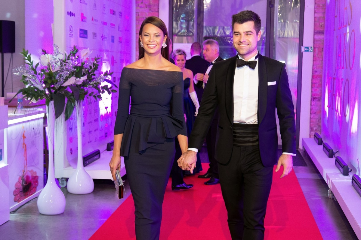 Another news star Sandra arrived in a simple red one-shoulder dress. That was quite a big surprise after having spammed her Instagram profile with new breast implants. I would have expected at least smaller cleavage, which would be definitely infinitely more interesting than this boredom. Not even speaking of the atrocious black clutch that wasn’t appropriate for a ball and seemed like a bigger shabby wallet… Her partner’s golden suit by Blažek.