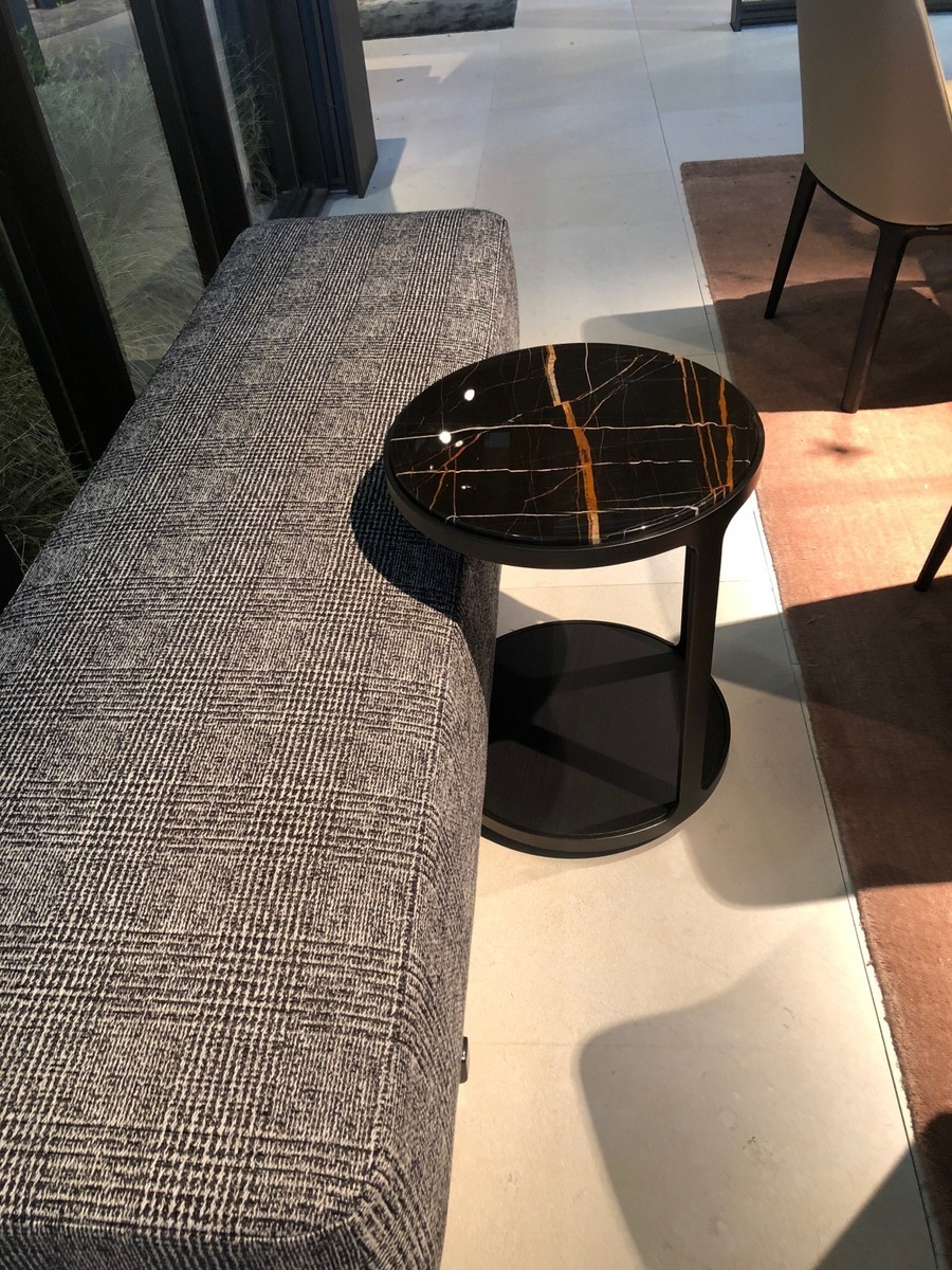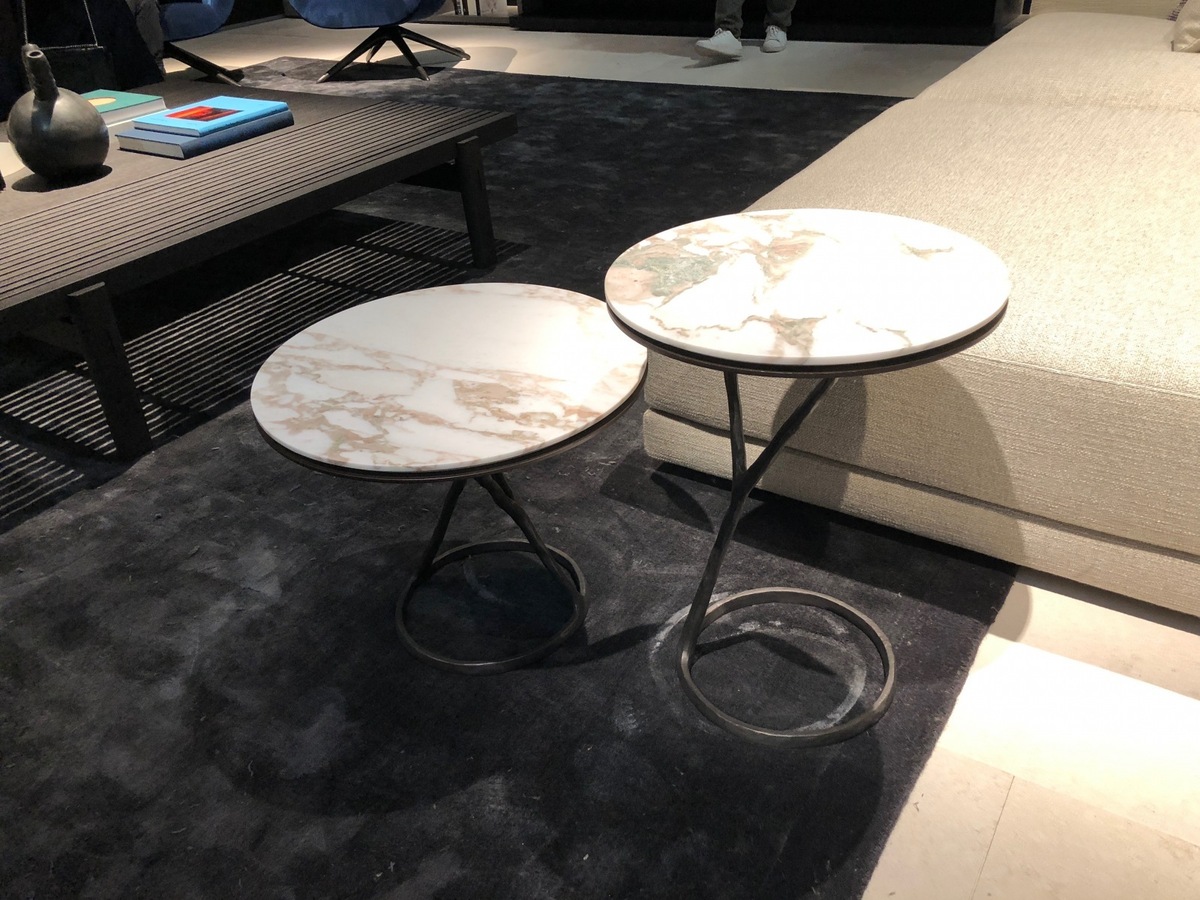 Another novelty are the Creek coffee tables in different shapes. The sofa goes well with a round one, but timeless larger square shapes are also available. The surface of the coffee tables is made of marble or glass. They have a metal structure and are open in their lower part.
