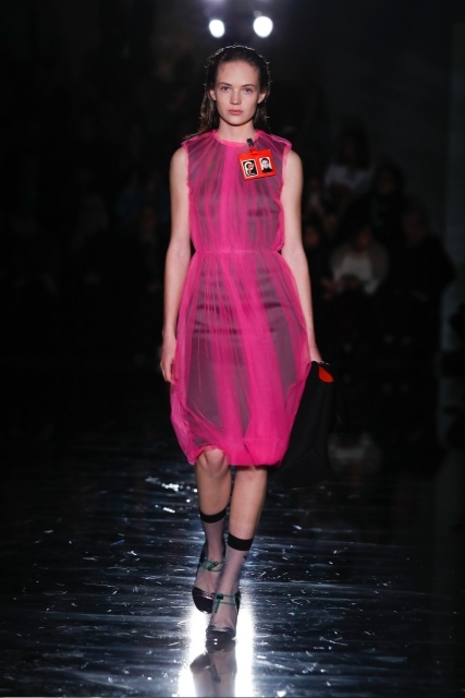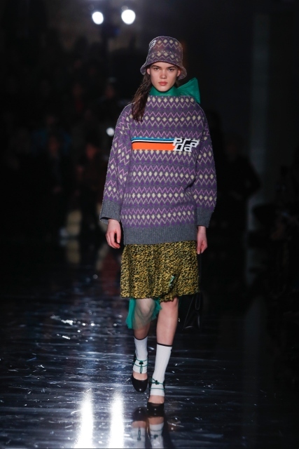 The Fondazione complex was really a great choice for the organising of the long-awaited Prada Autumn/Winter fashion show. The space was simply beautiful, clean, minimalist and boasting of awesome views of illuminated city of Milan, which, just like most cities, looked simply irresistibly romantic at night time. This accentuated the sophisticated atmosphere of the show, when on the catwalk finally appeared models in luxuriously bold models.
