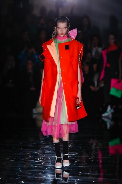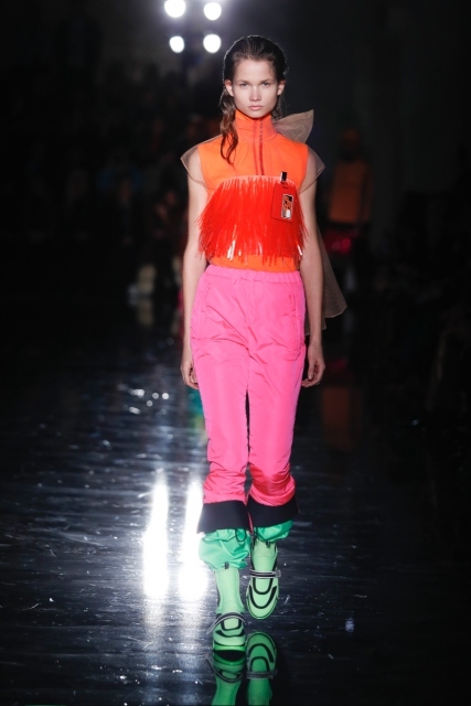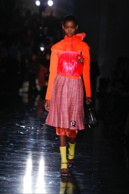 The luxurious FW 2018 fashion show started with dark colours in combination with neon tulle that lent the clothing an entirely different dimension and accent. The prevailing element were jackets, coats, skirts, but also dresses of fine shiny black fabric to which neon colours added flair and life. Simple black colour of the clothes thus turned them into unique items with attractive details. Gradually, tulle appeared on the models more and more - in several styles. The translucent fabric gave the models a great dose of sophistication and extravagance, which was slightly outrageous, but irresistible at the same time.
