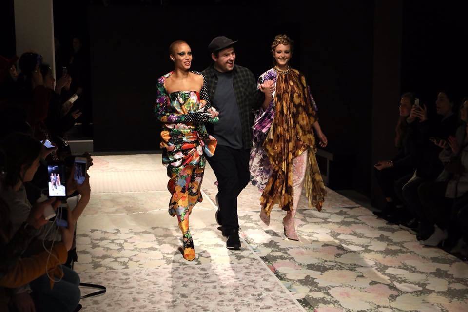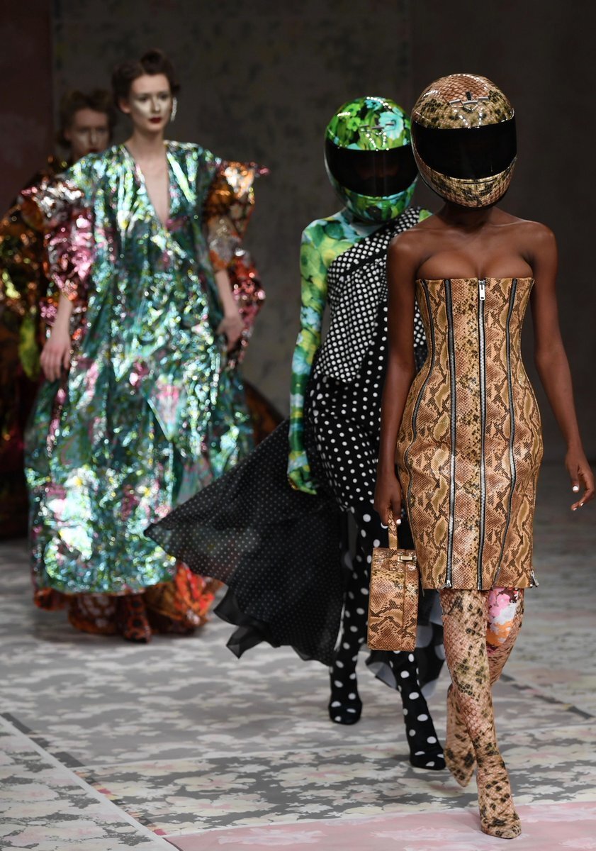 Richard Quinn creates clothes using innovative methods, he is not afraid to cut loose and his deluxe models are audacious. The FW 2018 collection plays with styles, materials and, most importantly, with accessories. Several models had their faces covered with a veil during this deluxe show, others wore helmets and the make-up artists assured the look of the remaining models by applying distinctive makeup.