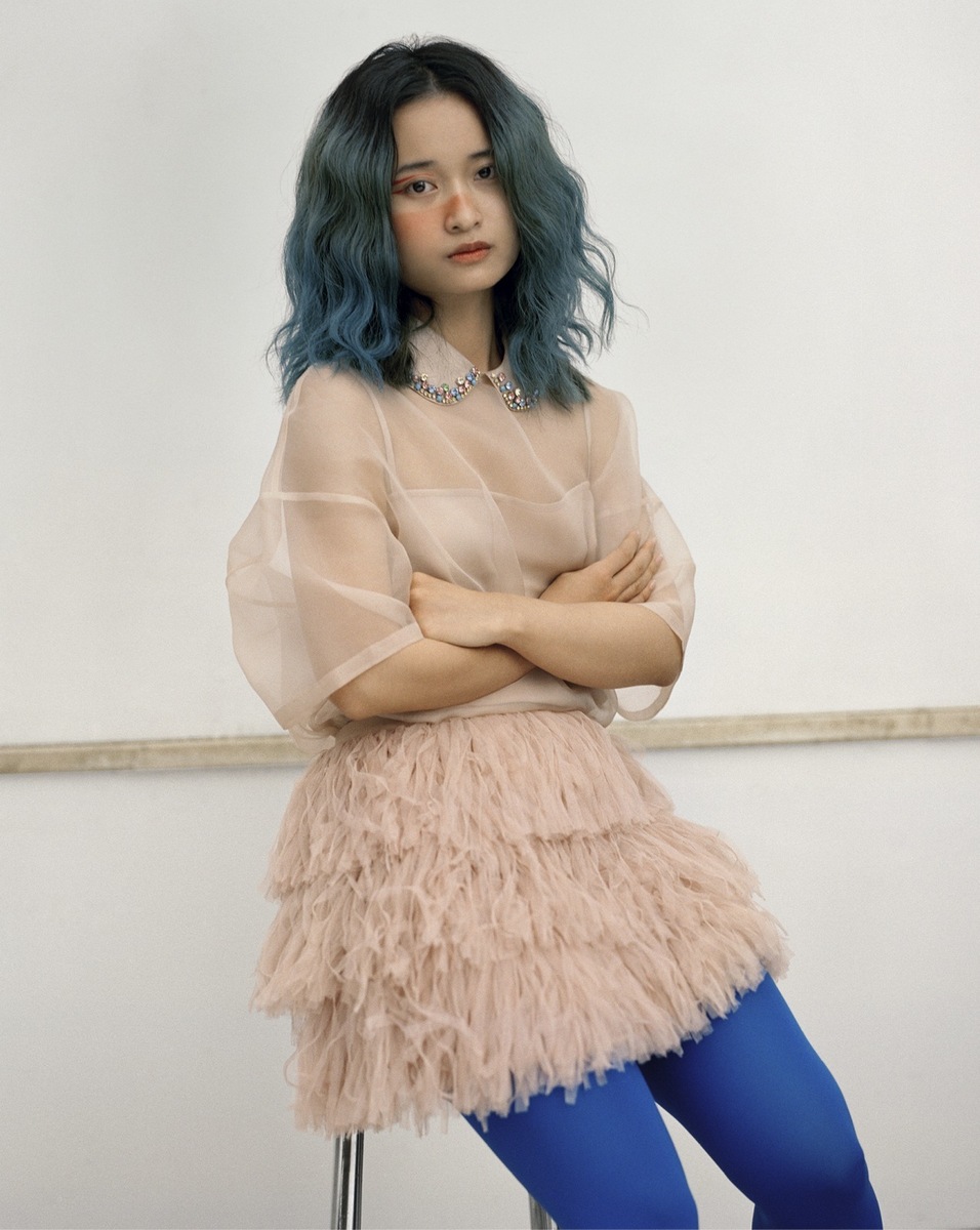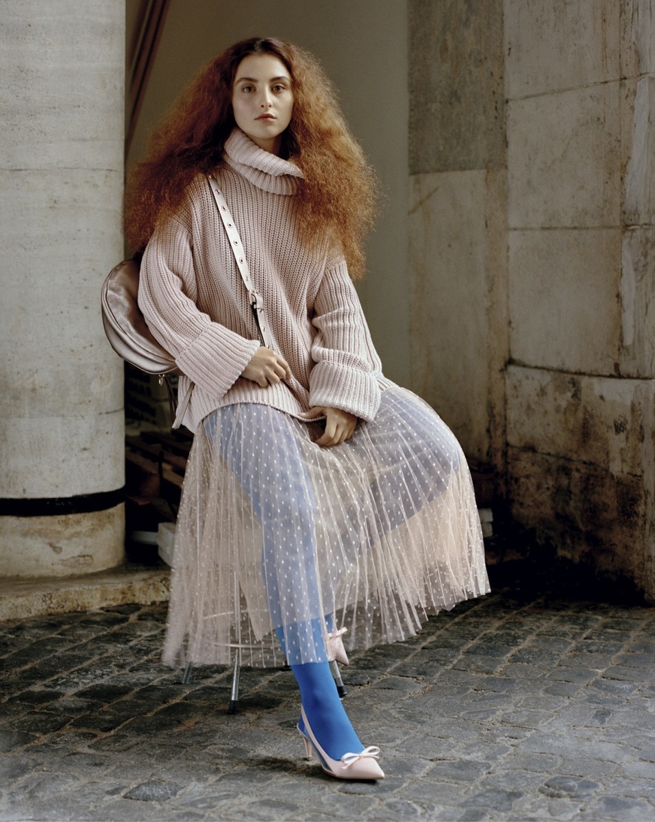 If I disregard the Smurf blue stockings, I absolutely adore the outfit with the oversized sweater, transparent skirt and pointy pumps on a mini heel. All this in delicate nude beige. In real life I’d wear at least one slip under that skirt, but apart from that, it’s perfect. For work, school, running around town, driving or simply on a restful day with a cup of coffee and good book. That’s what I call good times!