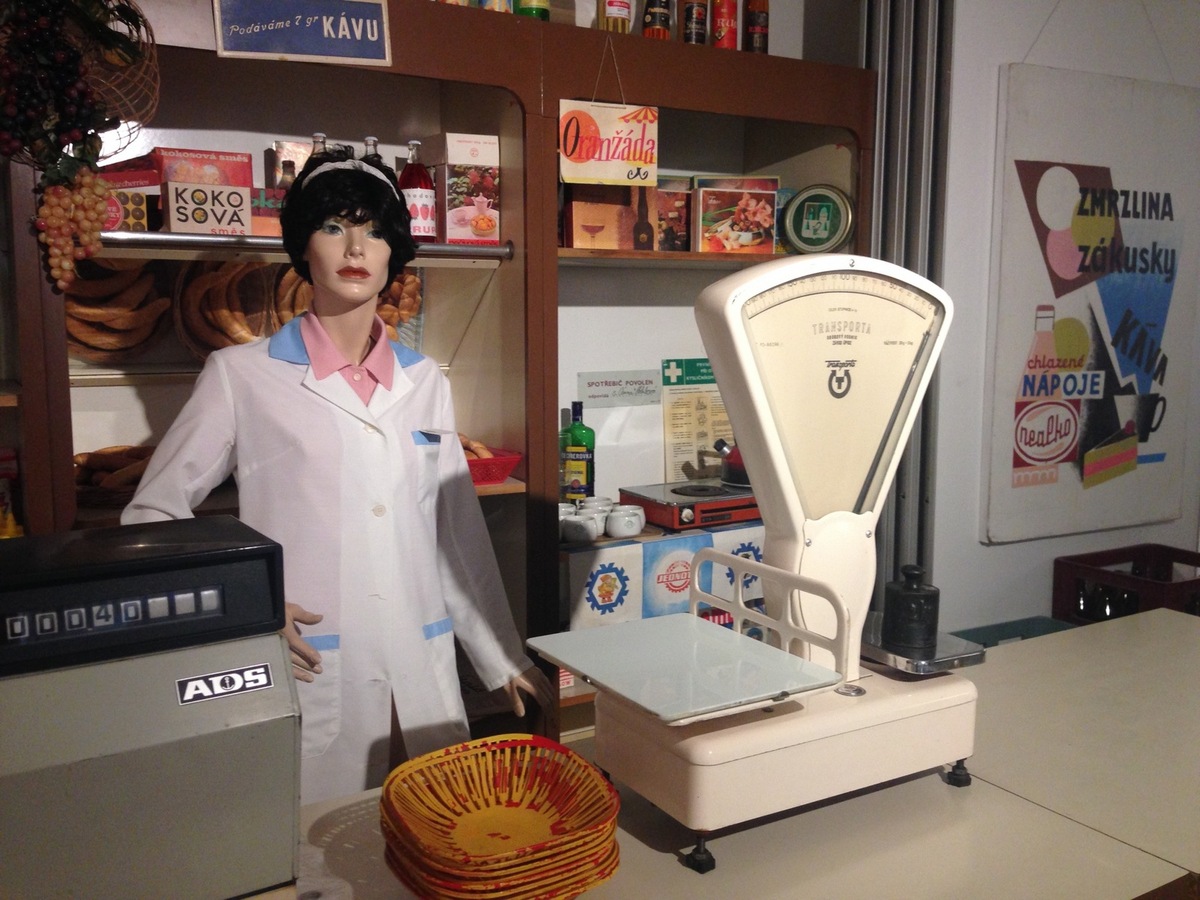 The exhibition extends over three different floors with the ground floor filled with the unmistakable look of the clothes and outfits of East Germany’s boy pioneer costumes, there are coin operated telephone booths from the same era and samples of the “then luxurious” cotton denim (blue jean) overalls. And this is just to warm you up. In the basement, you get a chance to see firsthand what was the then “socialist paradise”. Here a typical panel-type apartment building’s apartment has been recreated. You see and feel the living room, the kitchen with its period appliances, a bathroom and a holiday camping tent with all of the accoutrements, including a flashlight and unbreakable set of plastic dishes. Everything is so “perfect”. The dominant feature of the exhibition is a look at what was the then hugely popular TV series “Žena za pultem” [The woman behind the counter].