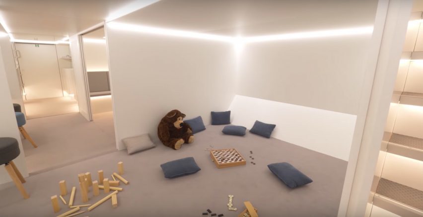 The model compartment will definitely be luxurious; featuring minimalist décor. Various types of modules will be dispersed throughout the aircraft, including bunk beds. It is also apparent from the concept that the aircraft with sleeping modules will also include amenities such as a bar, a child and family zone, conference zone, lounge and health care centre. The passenger sleeping modules will be very variable, functional and easily exchangeable for standard cargo containers should the airlines wish to change the configuration during a stopover or on the return journey.