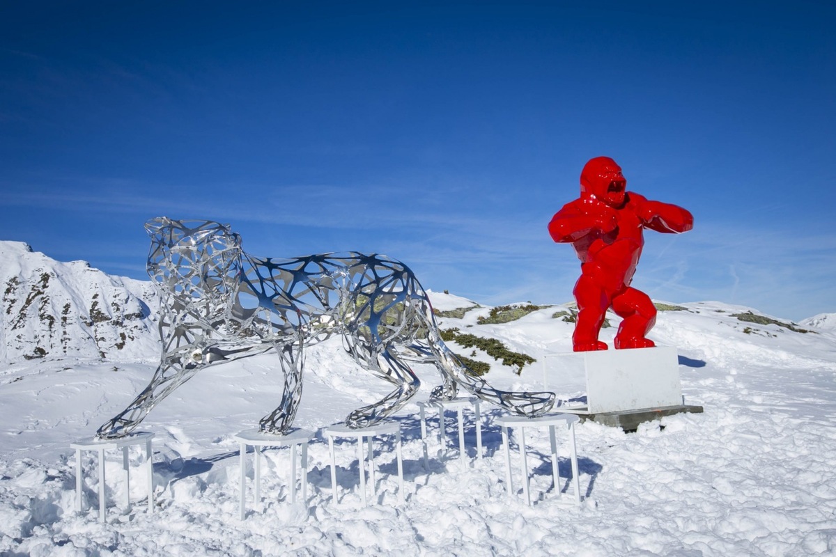 He often choose rich colors for his statues. This time it’s dark red, which forms a perfect contrast to the bright white snow. His mountain series is called Born Wilde and includes for example a larger-than-life gorilla and dinosaur. Regardless of whether it represents the untamed power of large mountains, wild nature, or the courage needed for a wild ride on skis, it creates an amazing winter dominant of the luxurious modern Courchevel resort.