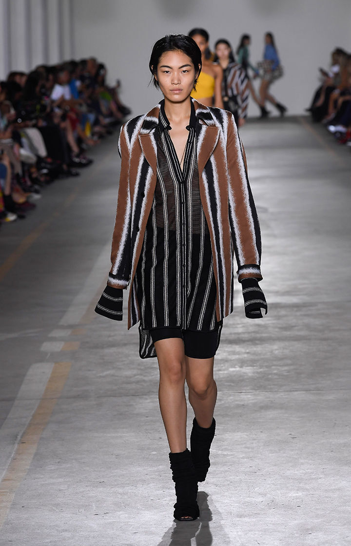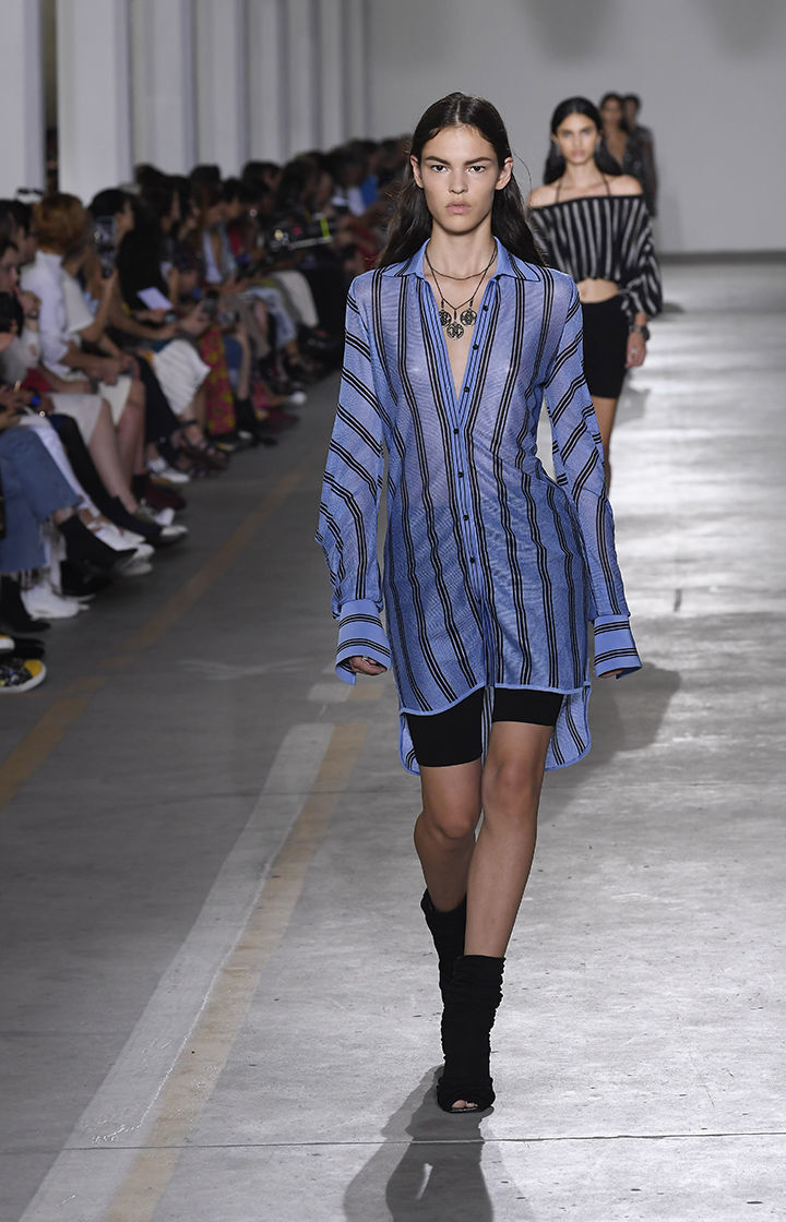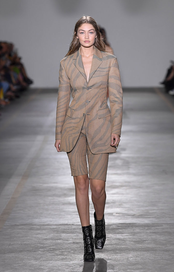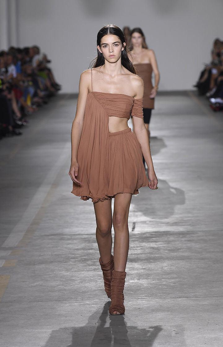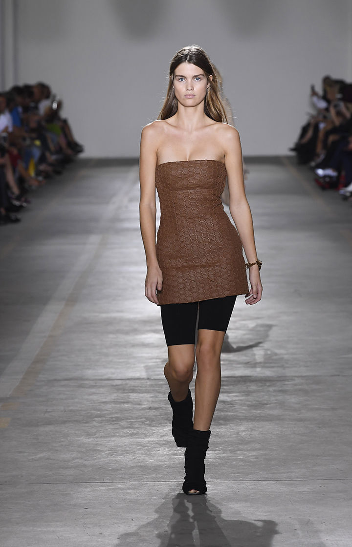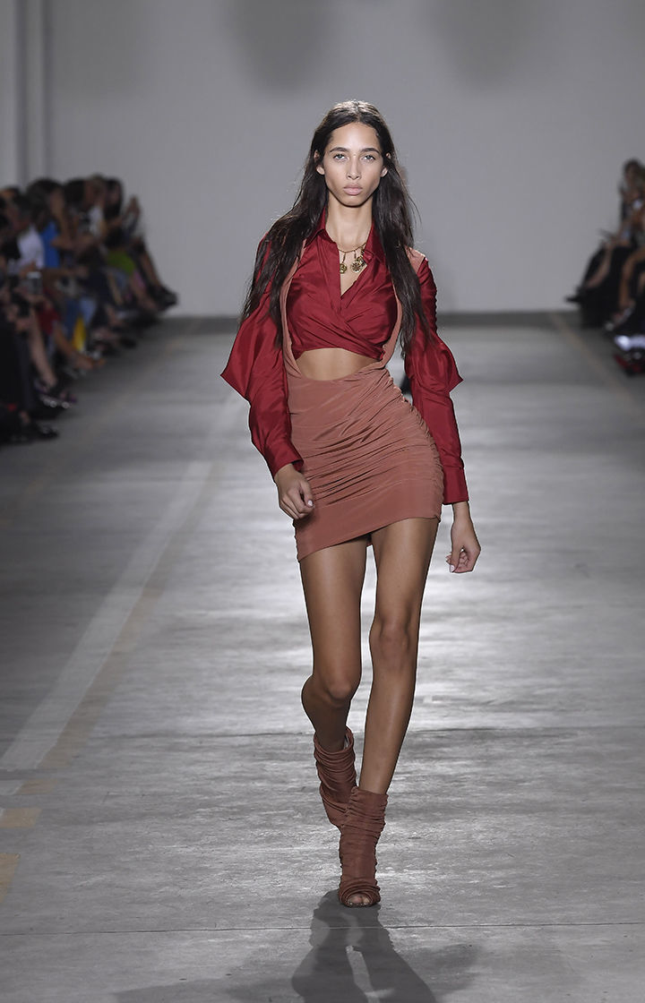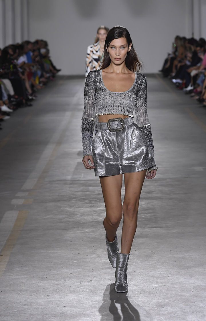Which pieces captivated our editorial staff? Those silver-futuristic ones worn by Bella Hadid or Meghan Roche. Another great sensation for us was the beige mini dress with a round neckline in the front, which in combination with a shiny claret shirt under her breasts, was worn by Yasmin Wijnaldum. The luxurious ankle boots with an open toe, which the model combined with it, only underlined this act of perfection.