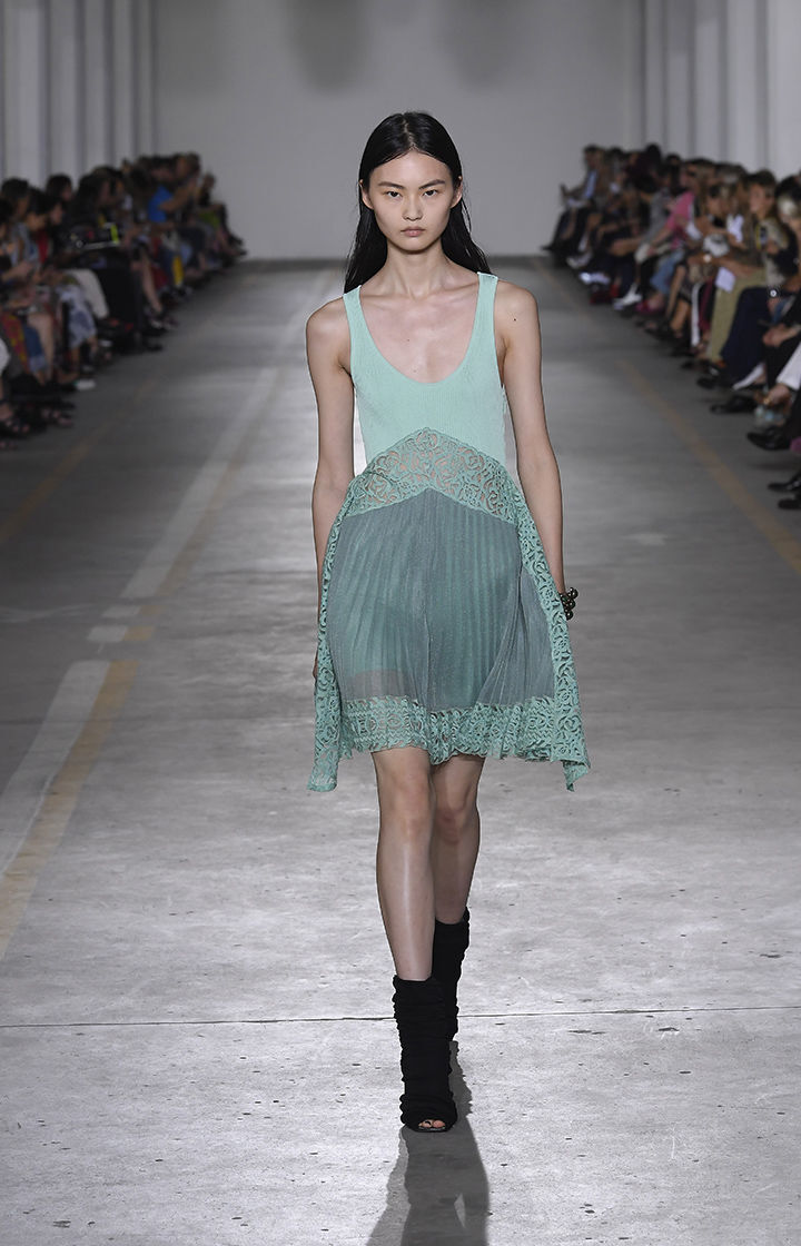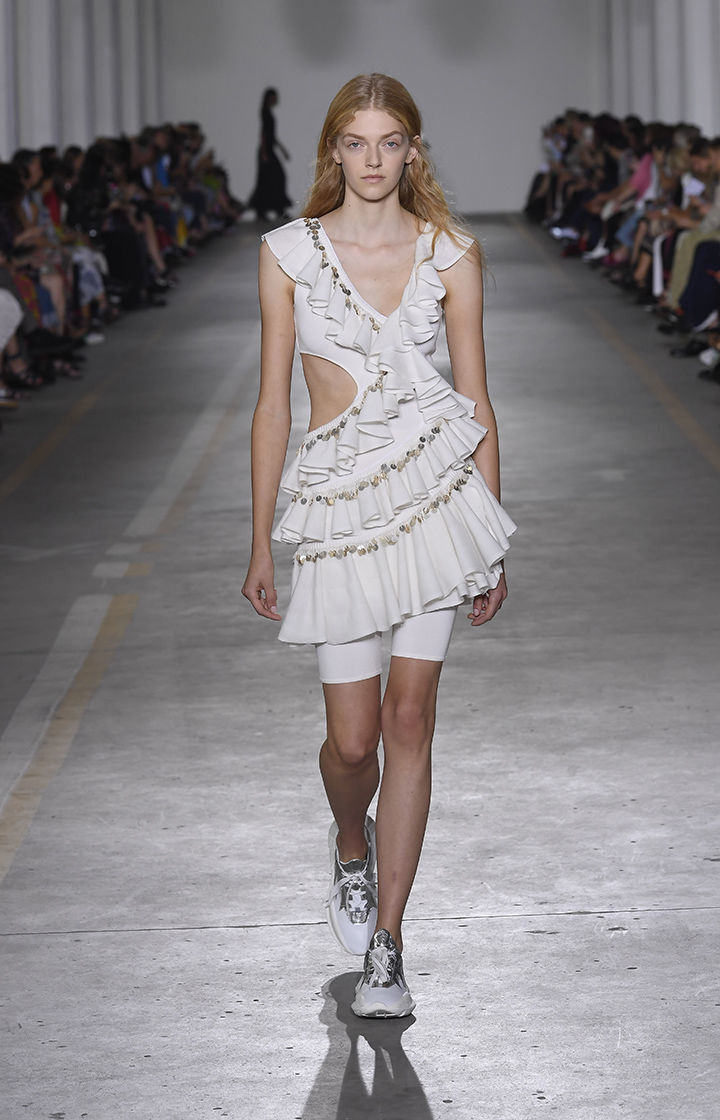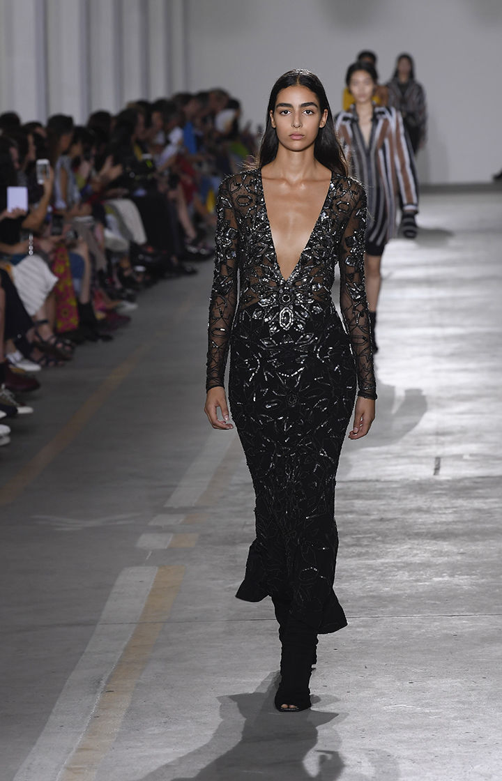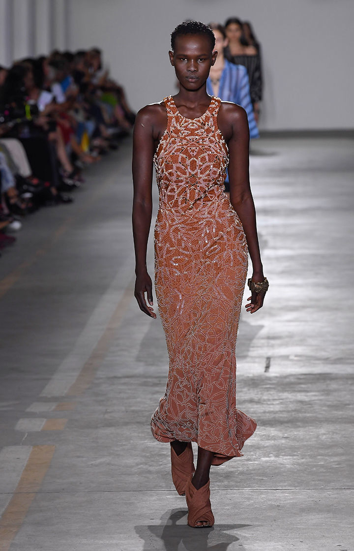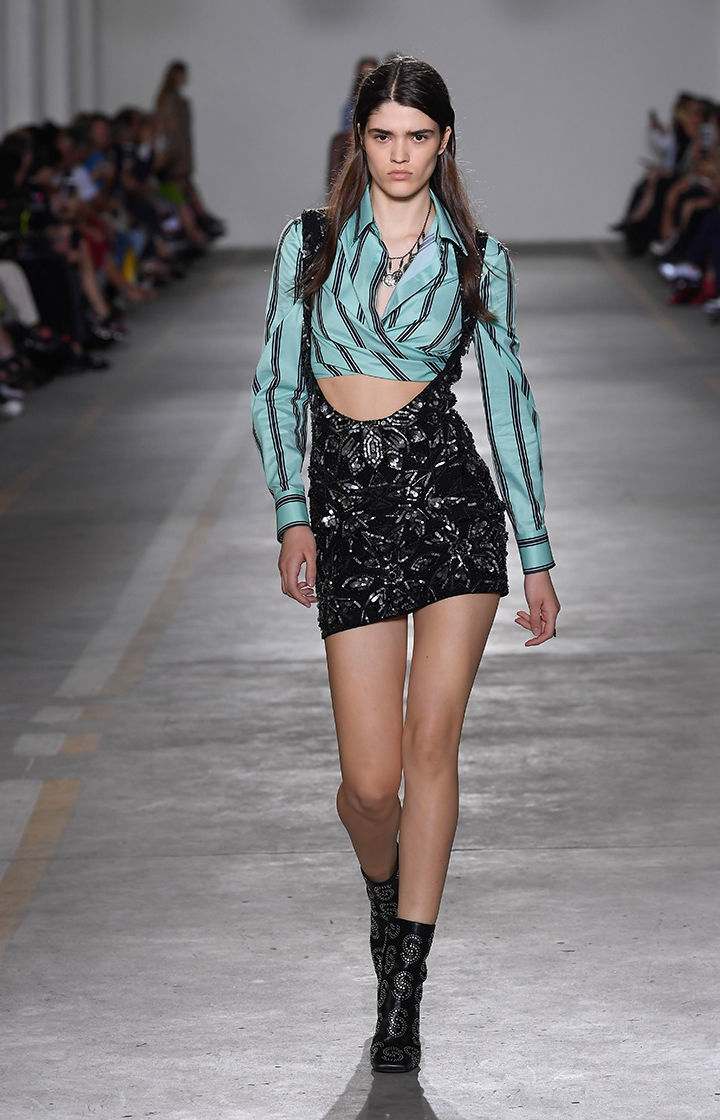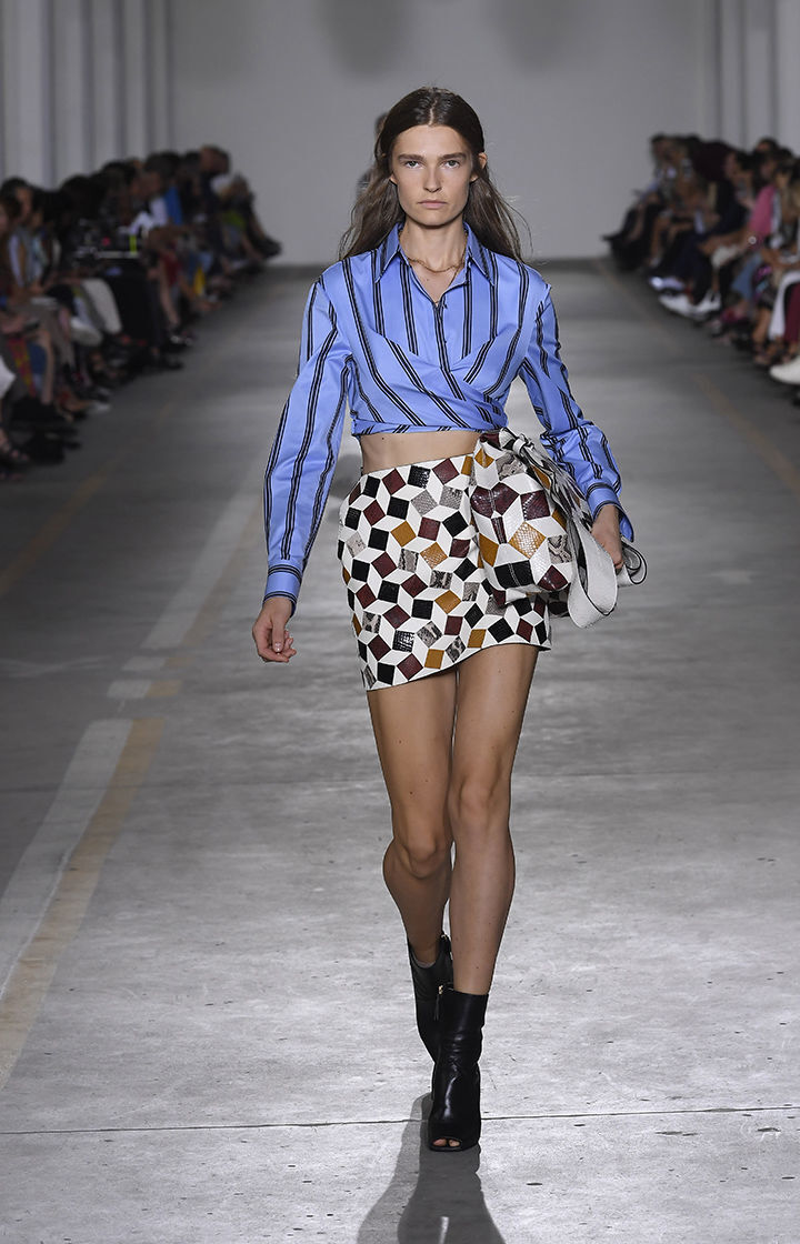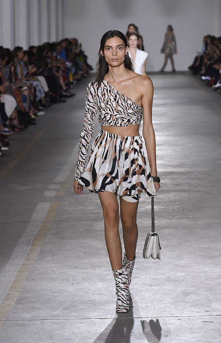 A great deal has already been said about the patchwork method, the sewing of small, multi-colored pieces of fabrics to create geometric patterns. Paul Surridge, the Creative Director of Roberto Cavalli, has recently come up with a method of applying it to snake skin. Since last year, the designer has moved from midi to maxi to mini, so it's clear that the SS19 is not a recapitulation and a reminder of the past, but a show of innovation, glitter, new techniques.