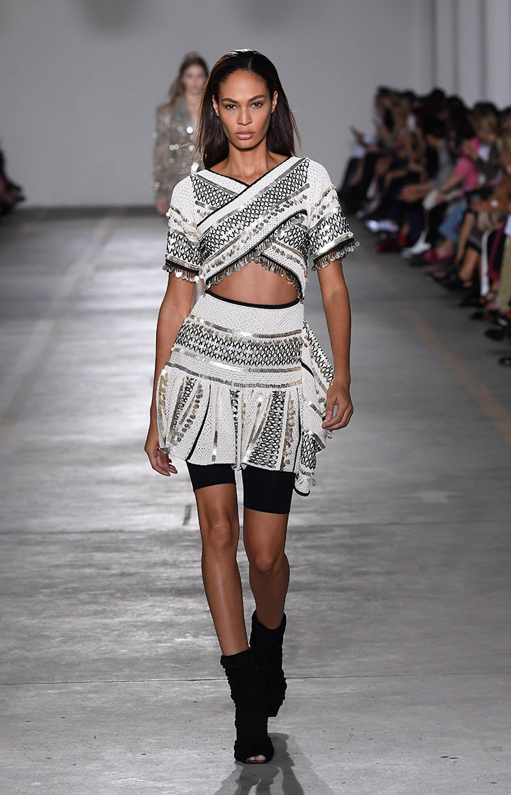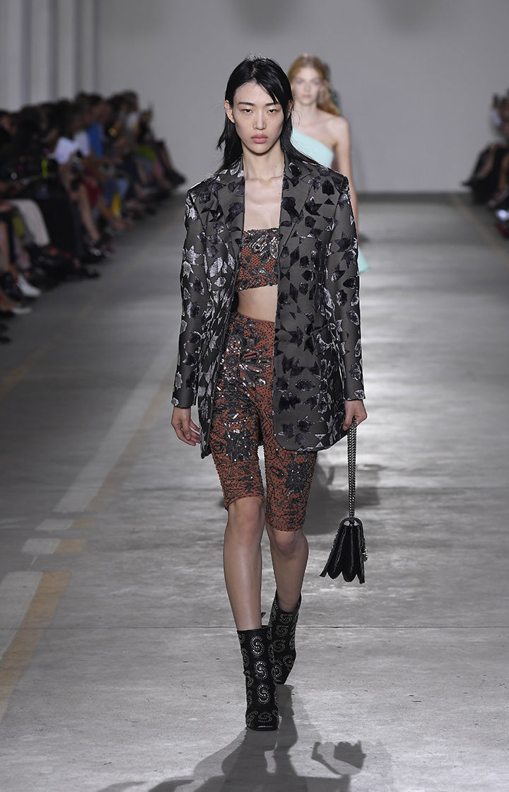 In Milan, Paul Surridge introduced hand-woven models of leather and silk, as well as pieces decorated with pailette silver embroidery. Decorating with tiny glossy items was applied to luxurious dresses, jackets, coats, shorts and tops.