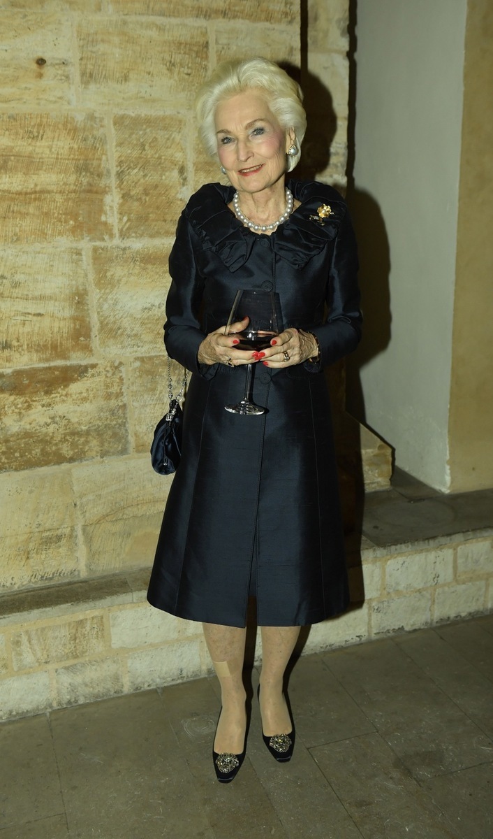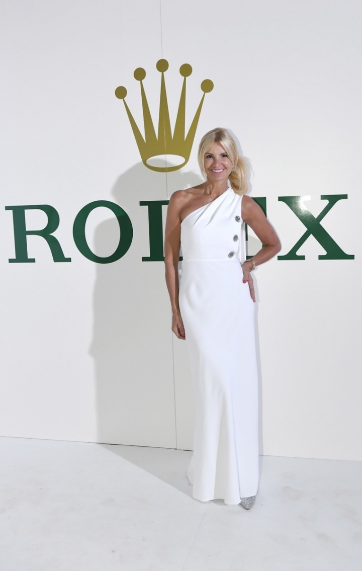 The former Director of the Office of Presidential Messages and the Special Assistant to five US Presidents in the White House is a lady through and through and at the Rolex party she demonstrated that once again. In a dark midi dress decorated with a luxurious brooch and a collar she looked delightful.