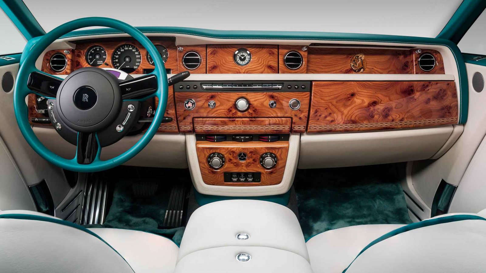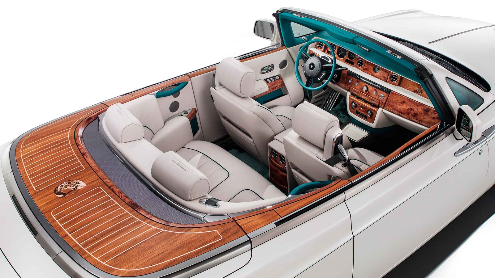 The Maharaja Peacock Phantom Drophead Coupé represents a masterpiece inspired by the beauty of the peacock, the Indian national bird, and the golden era of the kingdom. Luxury white leather complements the turquoise and handmade teak interior.