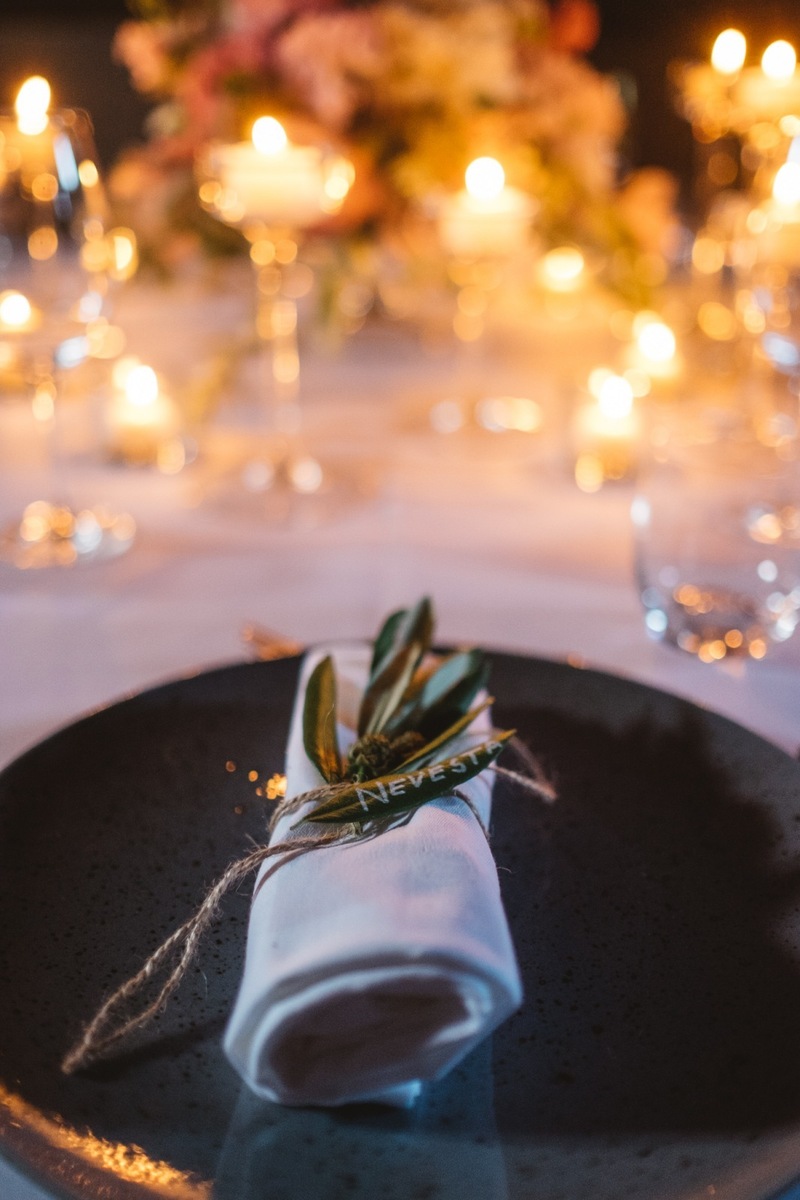 The wedding table is decorated with large but delicate arrangements in the middle of the table, while the glass candlesticks enhance everything and connect the table with the restaurant area that is dominated by crystal chandeliers. The napkins that each have a name tag are decorated with olive leaves and the names are written by hand directly on each of the leaves.