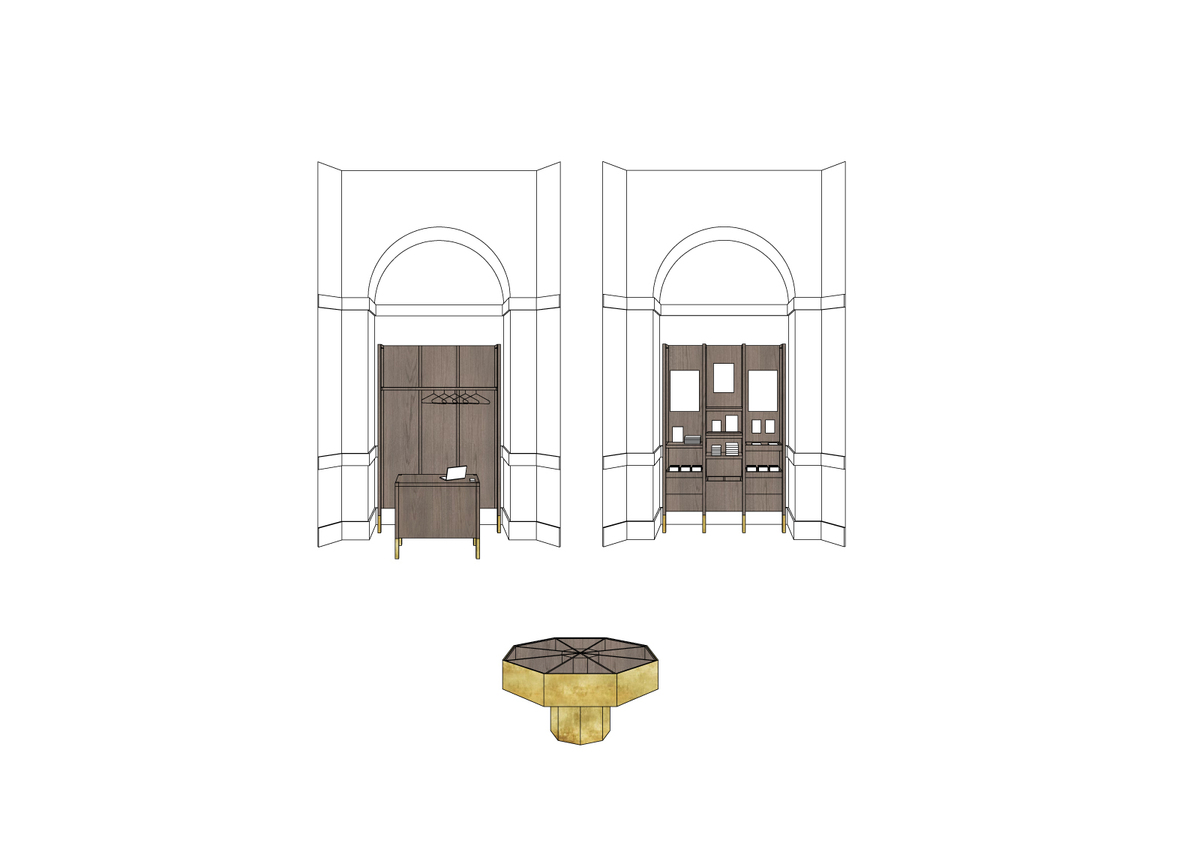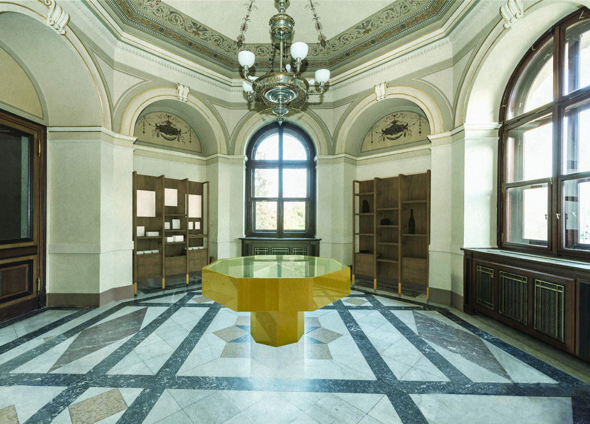 “The choice of materials is based on respect for the original architecture and the effort to interfere with it as little as possible. We have used primarily surfaces that already existed in the anteroom. Objects placed in the space are covered by a polished brass sheet with a mirror effect. The contents of the exhibition are carried by backlit panels with gold-tinted glass to form a monolithic unit with the brass plate. Photo attachments are printed on the glass in black and the texts on the next layer of glass are white, so as to be highlighted by the backlight. The brass sheet also covers the pedestal and the table in the lounges," said Lenka Míková about the material selection in her design.