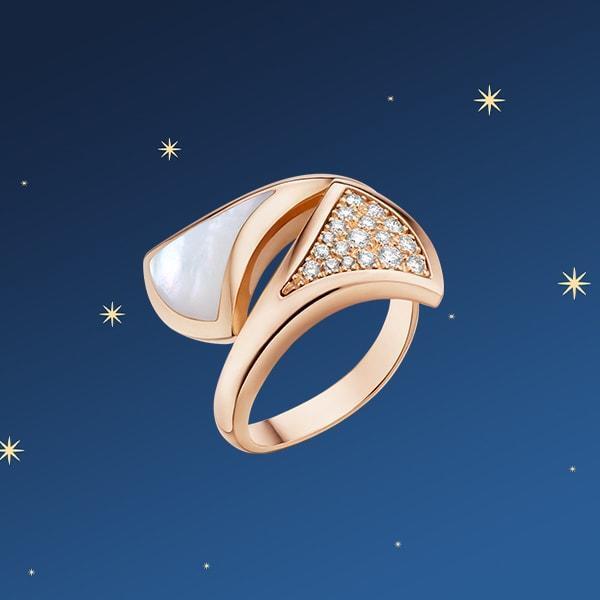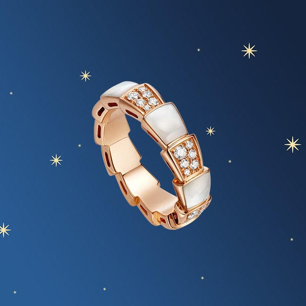 The BVLGARI wish factory represents several collections. SERPENTI VIPER is made up of luxury rings from 18 karat gold, diamonds or pearls. A coiled snake is the theme for the collection, symbolising vitality, wisdom and seduction. The DIVAS' DREAM collection is inspired by iconic divas, emphasises the essence of Italian femininity and draws on sophisticated mosaics from ancient Rome. It offers enchanting BVLGARI items from 18 karat pink gold, adorned with diamonds and pearls, or rings and bracelets from white gold, diamonds and precious stones such as aquamarine or pink tourmaline.