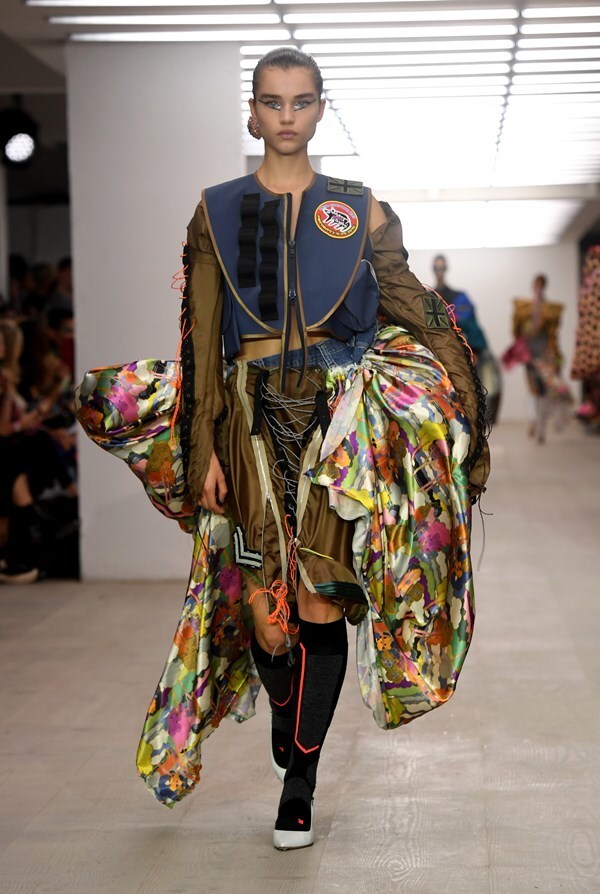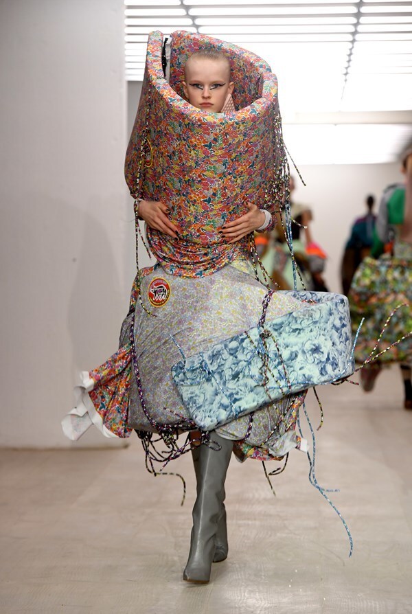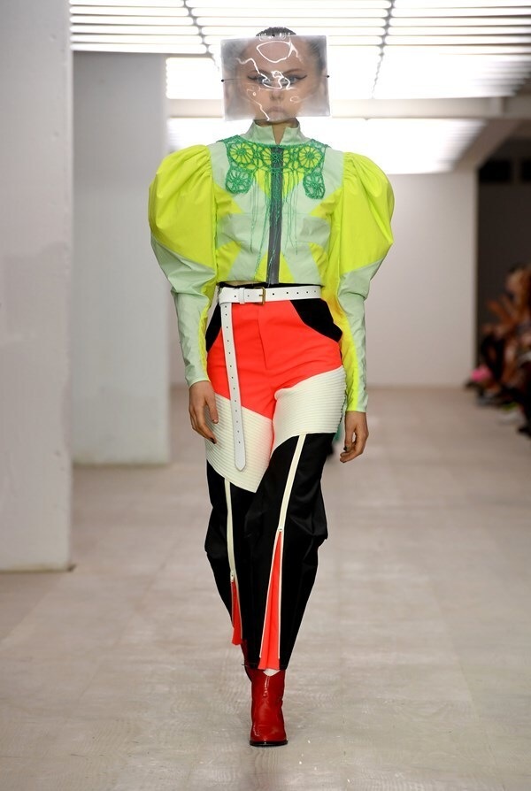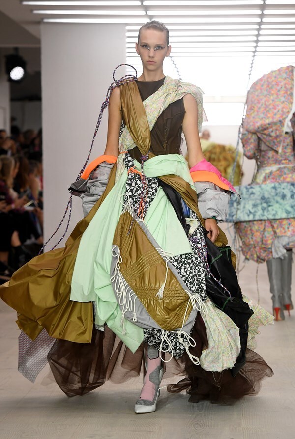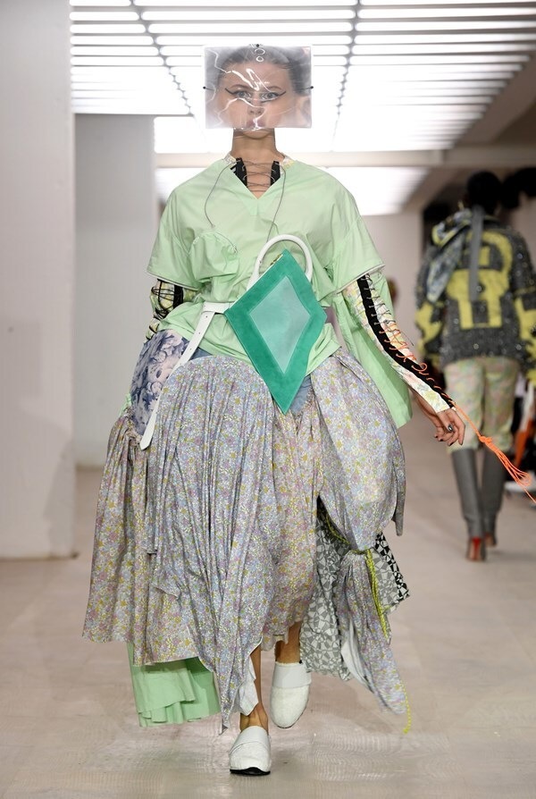 The young British designer, illustrator, and makeup artist has once again shown just how much imagination and creativity hides inside him. He presented wild creations full of colors, which he'd probably created from everything he happened to stumble upon in his studio. Trying to look for wearable and fashionable aesthetics here would be pointless, but the self-expression of the designer is something to behold. When you get angry with someone, put on, for example, this green outfit and let them know what you think about them once and for all.