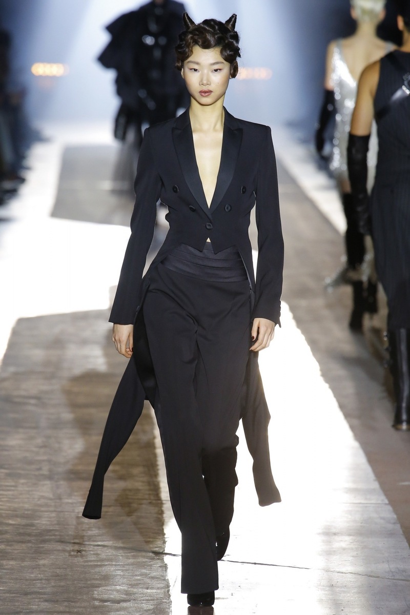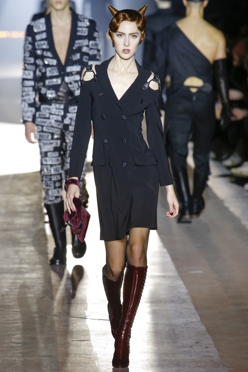 The luxurious show started with a sensual devil woman in black corset lingerie, high shiny lace-up boots and a men´s jacket. But that has been restructured to the liking of the rebellious fashion designer, Jeremy Scott. The upper part was replaced by straps, thereby turning the tailored piece into a very sensuous and feminine item! Some dinner jackets were transformed in a similar manner, thus creating elegant ladies´ attire suitable for any social event.