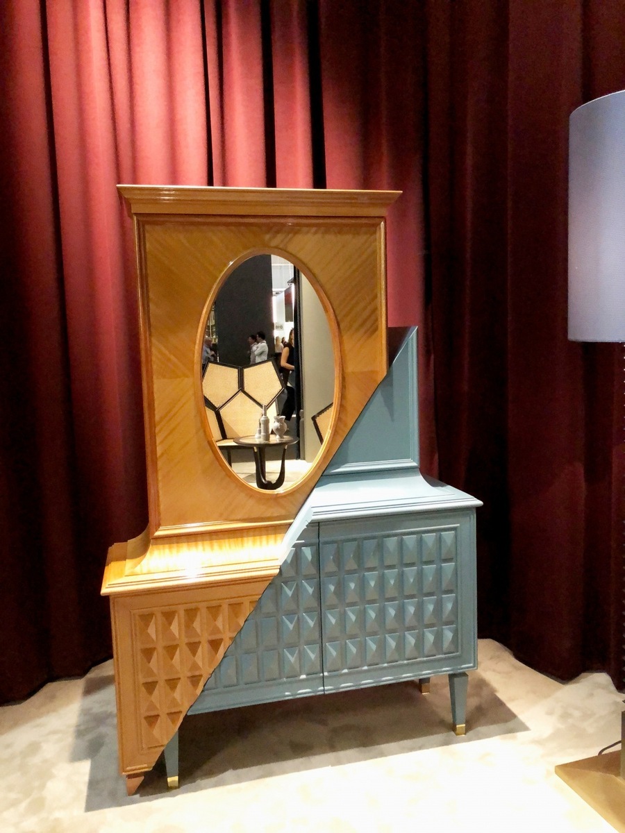 You can also see a magnificent, diagonally divided luxury D.Vision3 mirror by designer Ferruccio Laviani, which demonstrates inspiration by classic furniture. However, the design is embedded in modern style. Another large mirror placed on the wall has a classic carved frame, and its details are breathtaking!