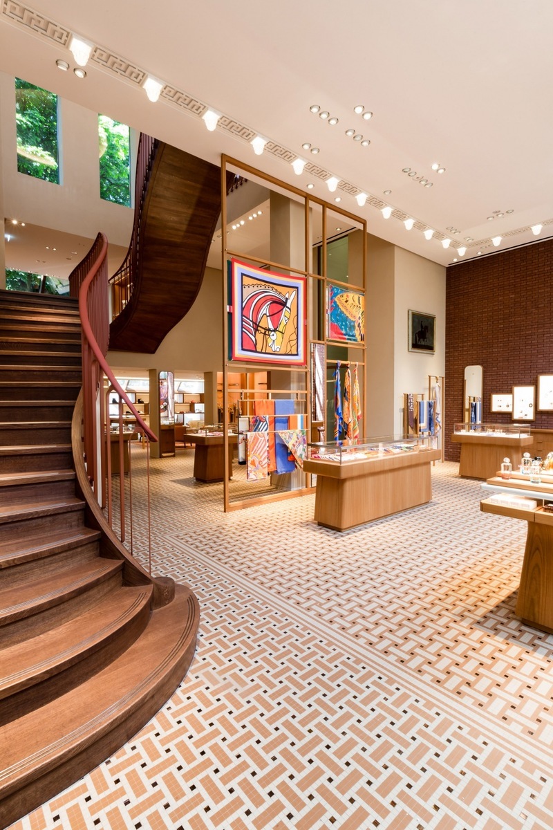 As for the interior, it is dominated by wood. Warm brown and caramel tones were used throughout the boutique. The floor is decorated with a geometric pattern mosaic and the curved staircase of dark wood with red leather railing adds a touch of luxury to the boutique.