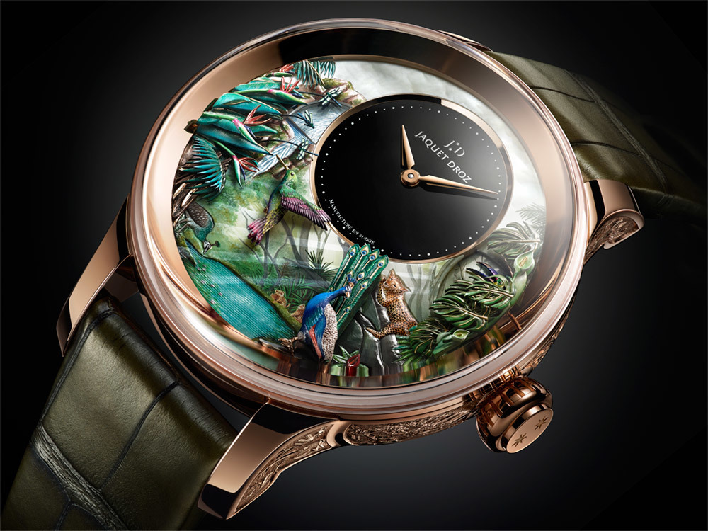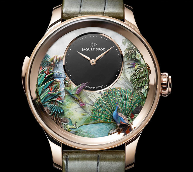 On the dial there are seven different mechanical animations: a waterfall, dragonflies, a peacock, tropical leaves, toucans and hummingbirds. For example the hummingbird moves up and down; a perfect animation of flight. Everything is rendered with masterly dexterity, visualization of perpetual motion is perfect.
