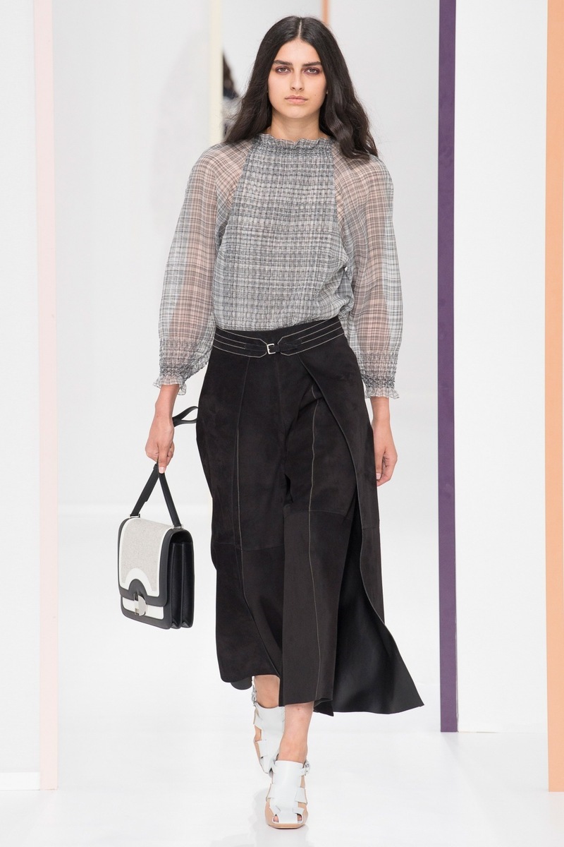 Designer Nadège Vanhee-Cybulski surprised everyone with her approach to the collection. In addition to interesting patterns it offers a wide range of colors: from unique green tones, to pink, orange, blue, gray and decent soft shades. There is something for every woman! The collection mostly features high-waist pants, long, short and narrow coats, as well as long skirts.