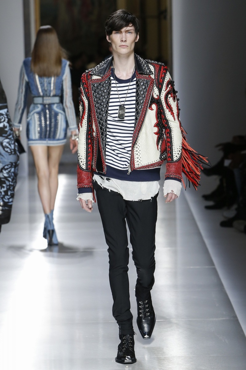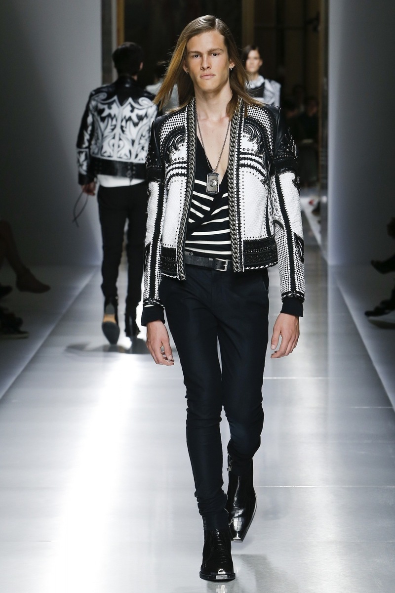 The young and talented Olivier Rousteing did not just stick to rock elements in creating his collection, but also played with other interesting styles. There are navy stripes (in fact he wore a sweater of this type at the fashion show), beige safari jackets and suede booties in the same colour, which are an interesting counterpoint to hard rock. There are also garments suitable for highly formal events – suits, luxurious tuxedos, shiny lapels and highly elegant trousers with pleats.
