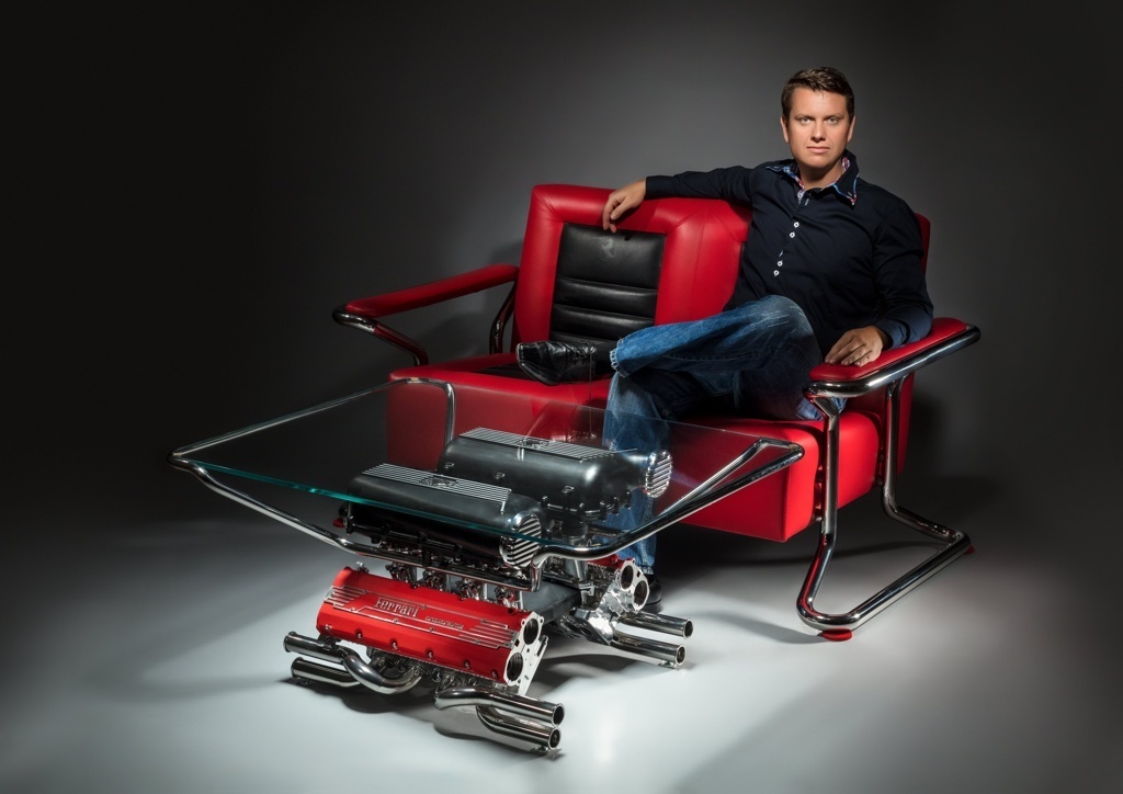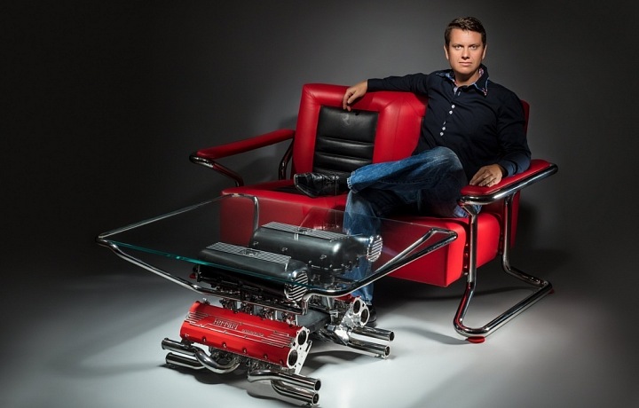 Štěpán Marek designs and manufactures luxury interiors accompanied by the smell of petrol. He uses engines or other parts of big-name cars as the basis for his work. Would you like a table made from a Porsche wheel? Do you dream of a complete interior made from a Ferrari engine? Fantasy knows no bounds.