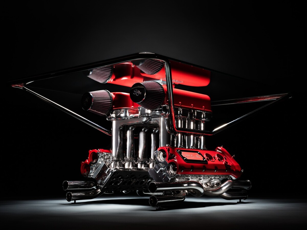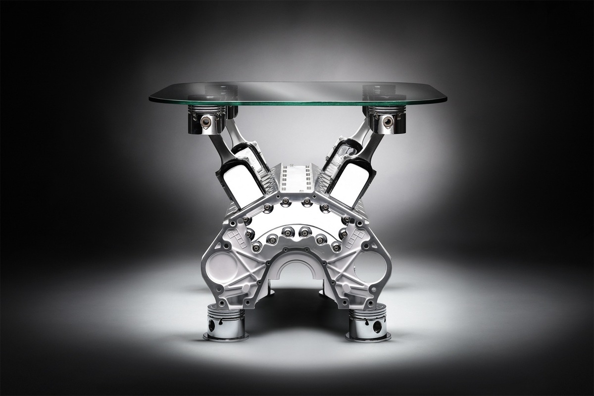 Treat yourself to a glass of superb whisky on a table made from a V4 Mercedes Benz Ponton engine with the top half of the aluminium legs upholstered in leather. It will taste just as exceptional as that from a luxury table made from the engine of a Jaguar, the head of which has been highly polished. It has gold-plated nuts and bolts and the stone base plate is made of luxurious onyx.