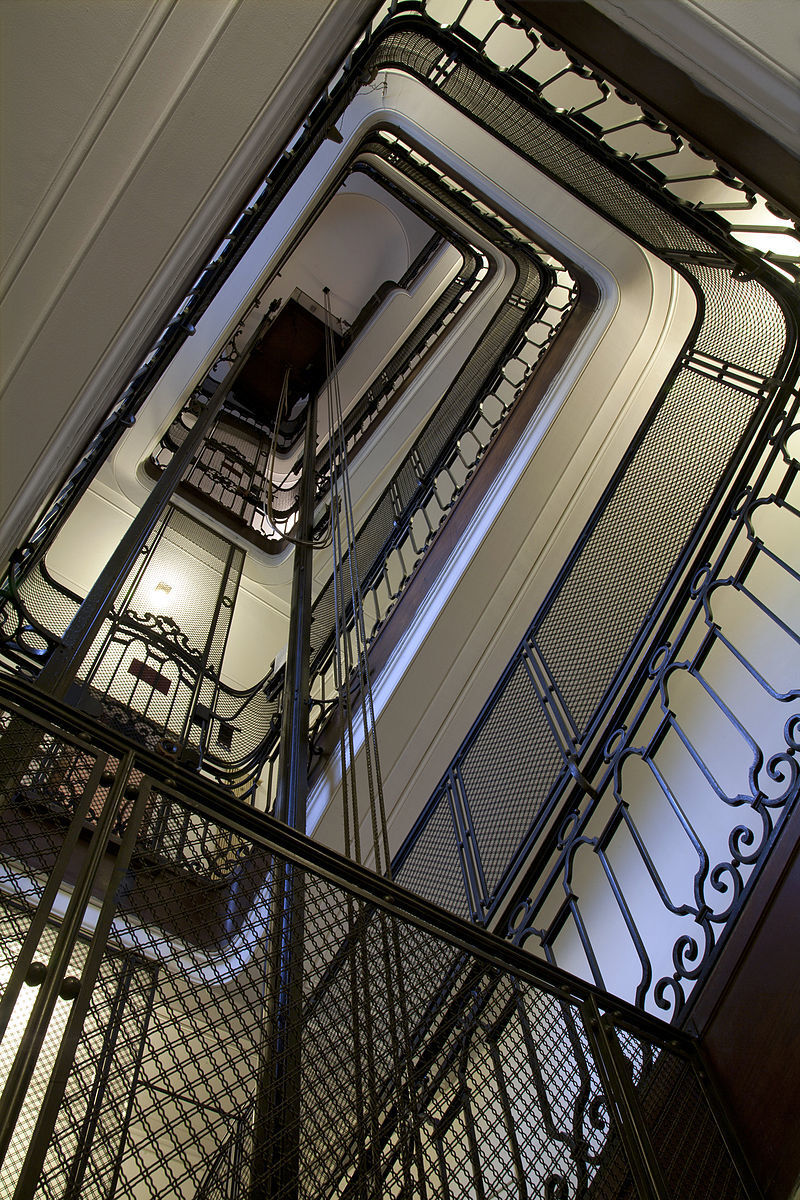 The building is entered through a labyrinth of two coat rooms, leading to the central rotunda and the winter garden, separated from the outdoor terrace by a glass wall. The ground floor served for social functions, while the first floor was reserved for the family of Otto Petschek. There is a seven-room apartment on the second floor. The specific features of the villa include a music salon in Louis XVI style, a room with a mirror wall and a special floor for rhythmic lessons, a gym and an 18 metre basement pool. There are 148 rooms in the building in total.