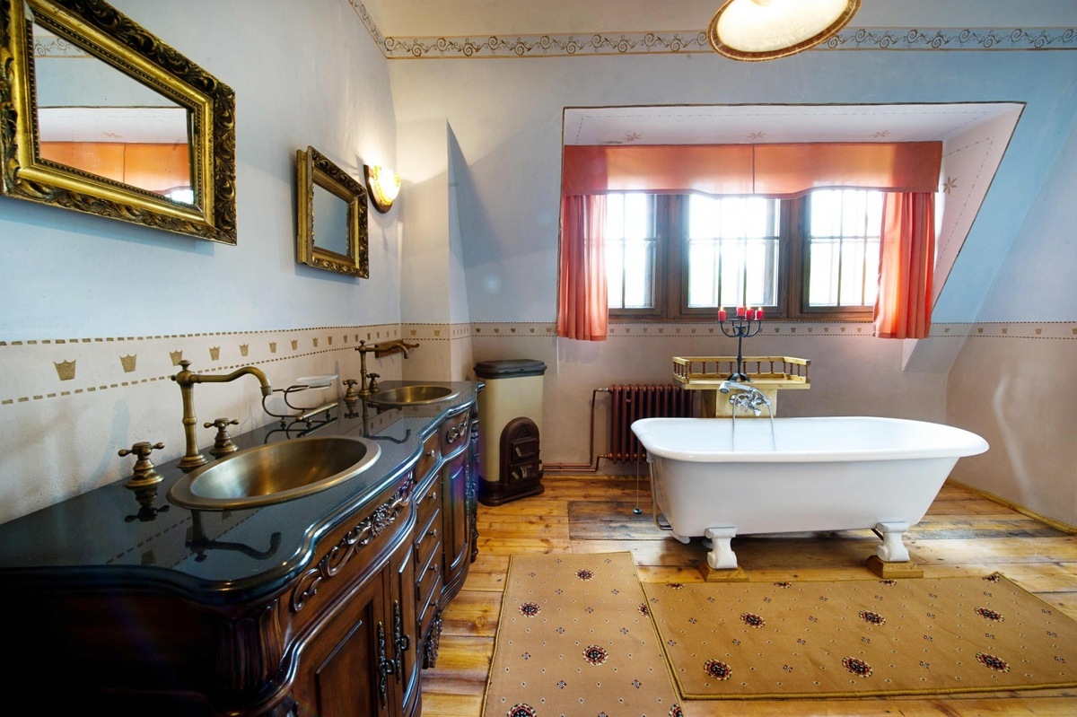 The extravagant room of Jan Werich on the other hand has a lot to offer especially for men. It is decorated in a knightly style and the black-and-white bathroom is truly a jewel of design.