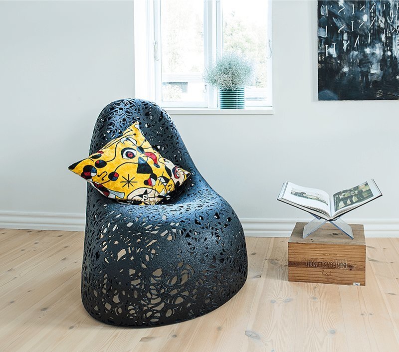 We absolutely fell in love with the chairs from the Black Series. They look amazing and are made using a special basalt melting process. They are unbelievably strong (allegedly even stronger than steel), they can be hung from a tree and are truly comfortable to sit in. The author is Raimonds Cirulis from Lithuania and no one else makes furniture from this material.