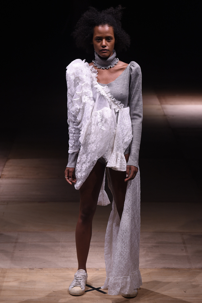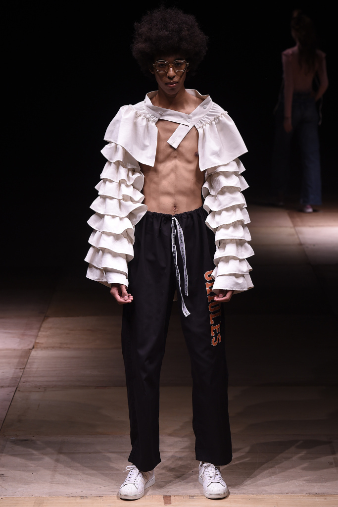 The models are full of frills, lace and tights. This wouldn’t be strange on its own, but these feminine elements were used to decorate mostly men’s clothes. Genderless is the key concept here. The collection blurs the differences between genders, breaks boring rules and makes you feel like entering a whole new dimension of reality. The colors do not help with the masculinity either; the collection is full of neutral colors such as white, beige, brown or slightly brighter blue.