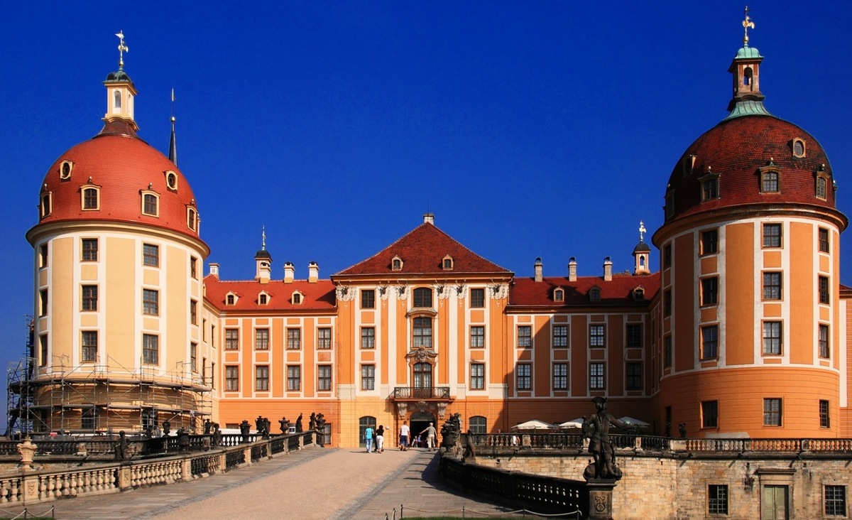 This beautiful moated chateau in Saxony is named after Duke Maurice of Saxony, who had a hunting residence built here in 1542. During the rule of Prince Elector August the Strong from 1723, the chateau was magnificently rebuilt under the direction of Matthäus Daniel Pöpplmann, the well-known architect of the Zwinger in Dresden. He created a suitable environment for his lively celebrations.