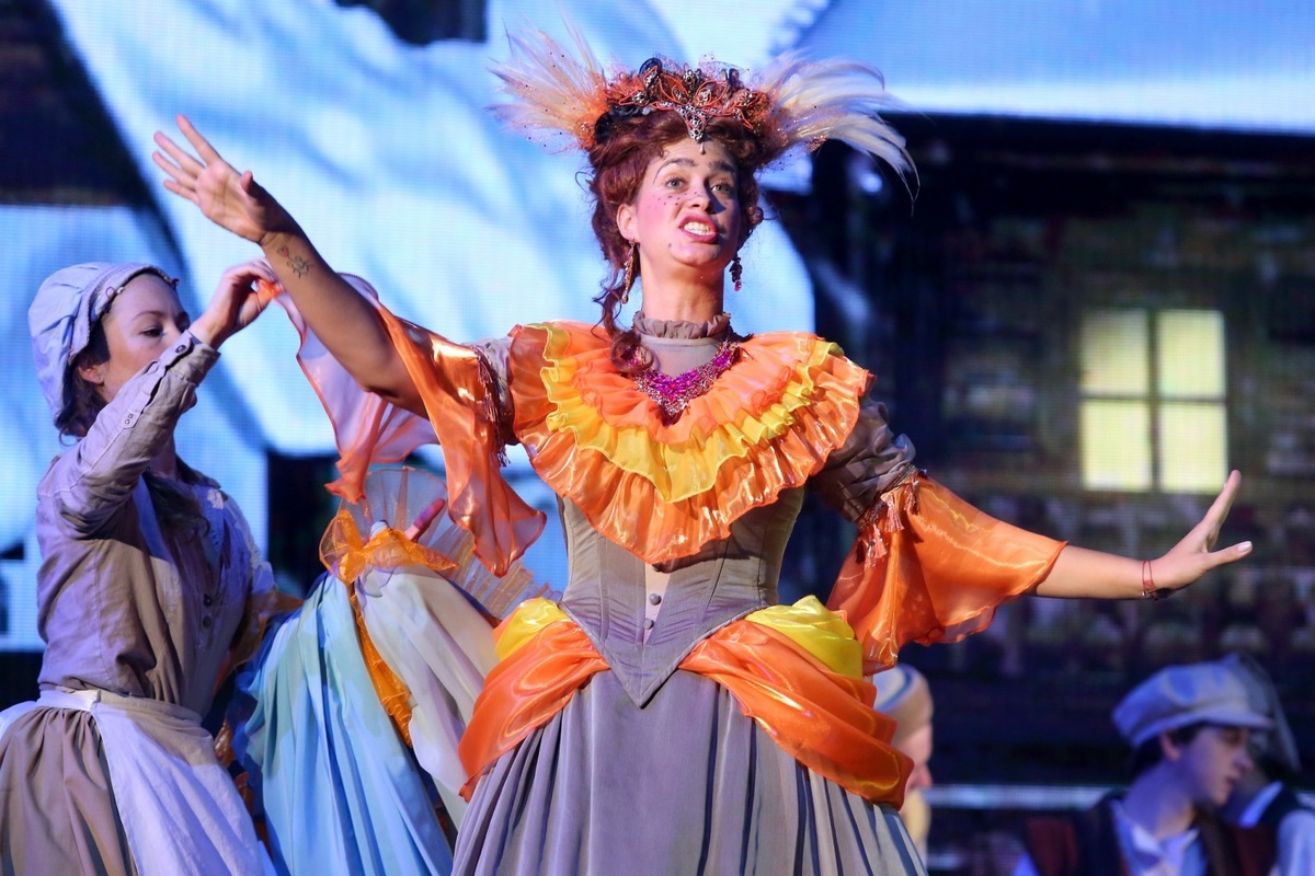 Kept the text and only put the song into the story for the main heroine. Her stepmother and stepsister Dora get a few songs, too. The new concept of stage decoration in the form of large projection panels draws the audience into action, so the illusion is practically realistic as in the movie.