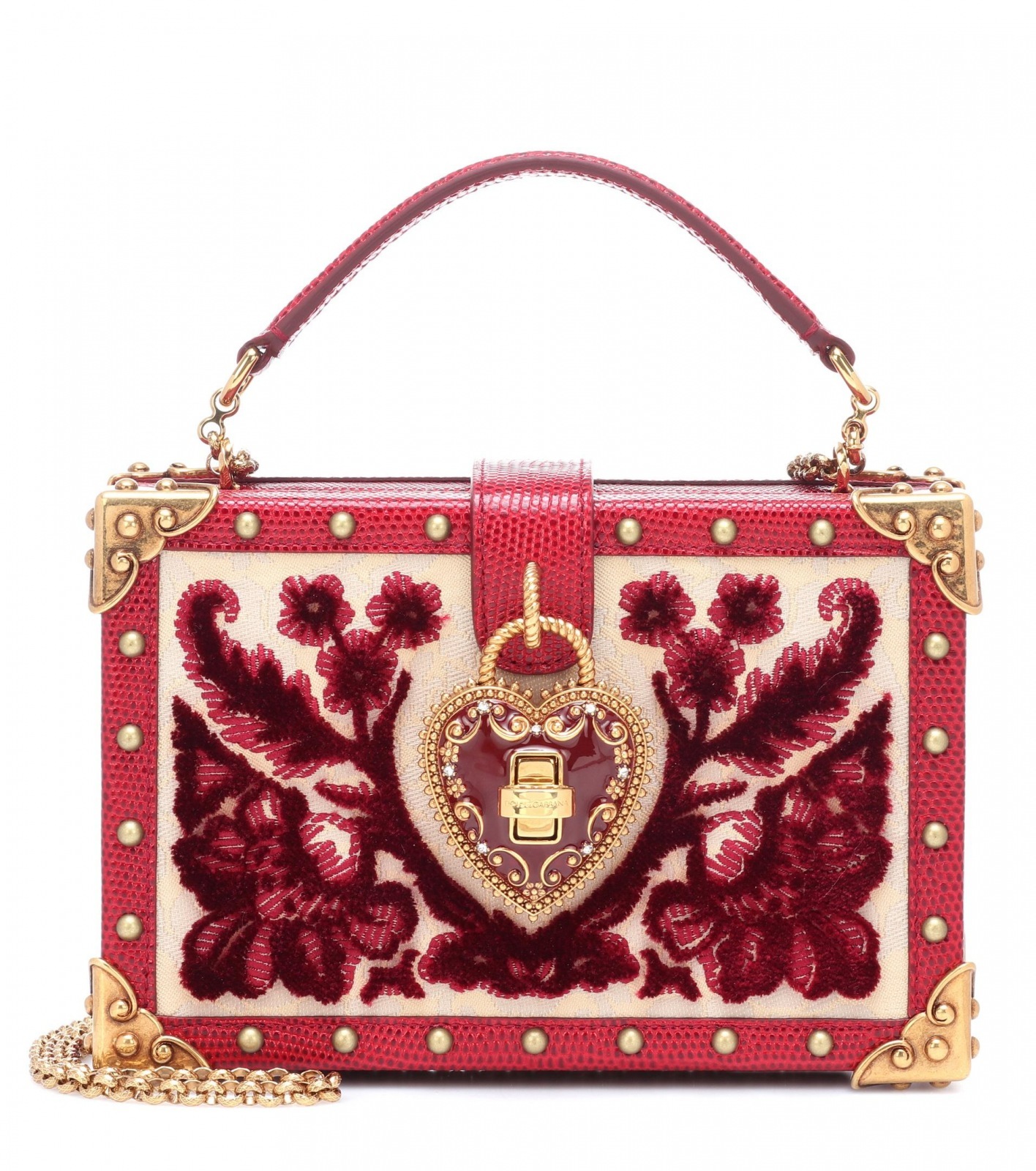 You can notice detailed workmanship on the rectangular suitcase shaped pochette by Dolce & Gabbana. The flower embriodery, gold studs, and ornaments at the corners of the handbag in combination with a simple strap look glorious.