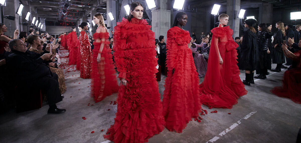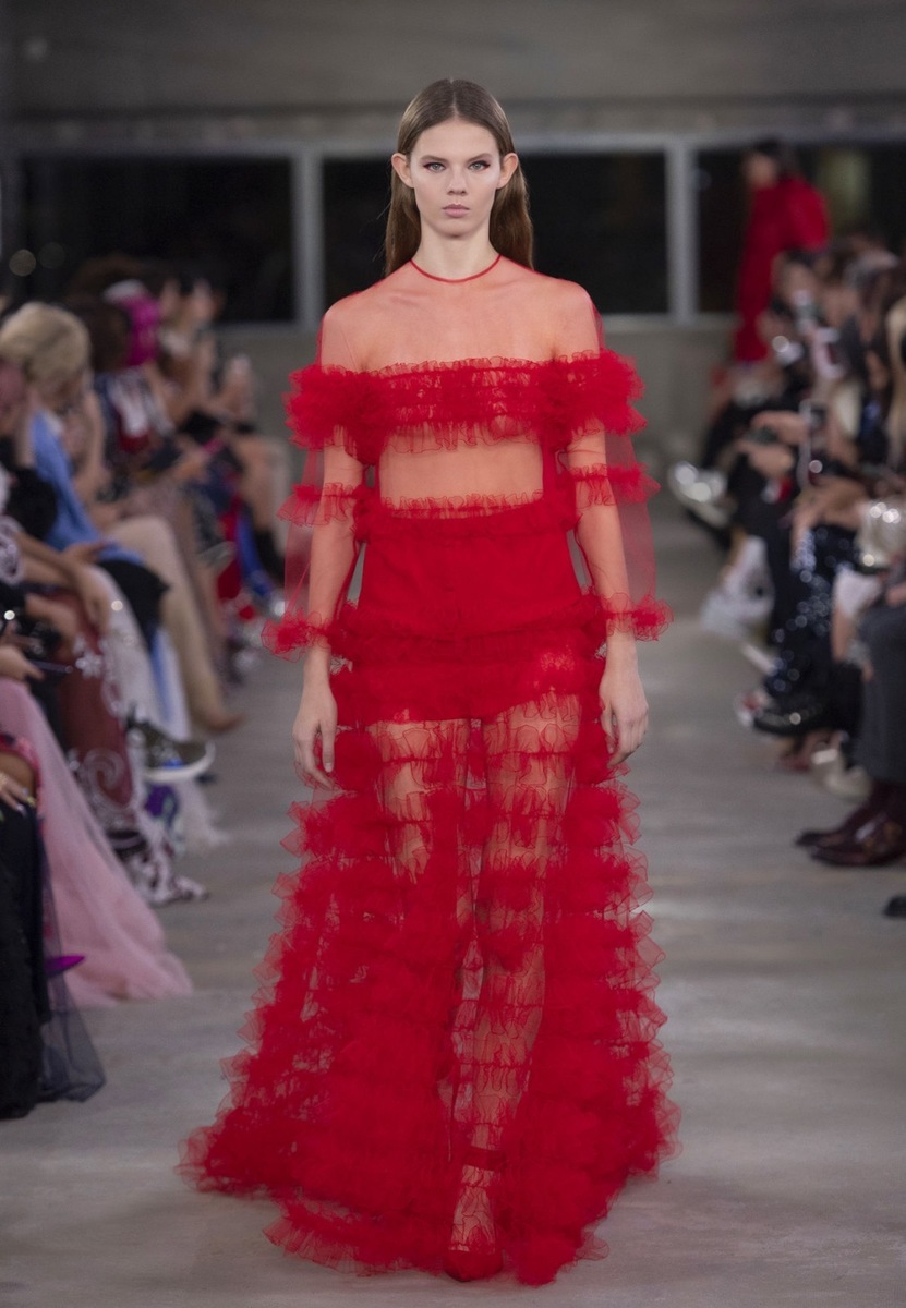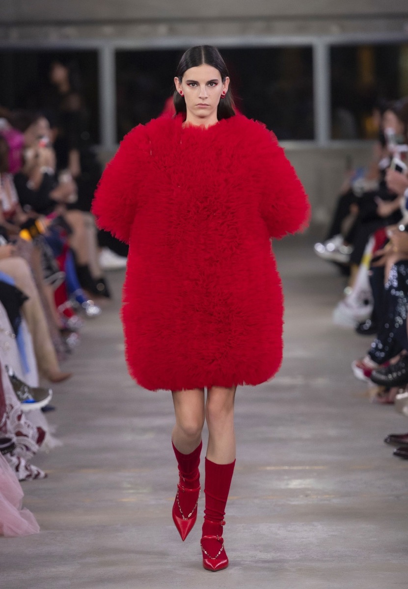 The designer focused primarily on the shades of red and black, dramatic, sharp and oversize cuts, bold ruching and details. Some of the models were embellished by the Valentino logo, symbol of a crescent and in some cases also flowers or geometric patterns. The combination of these elements ensured the keeping of the hallmark of romance which is encoded in the DNA of the fashion house.
