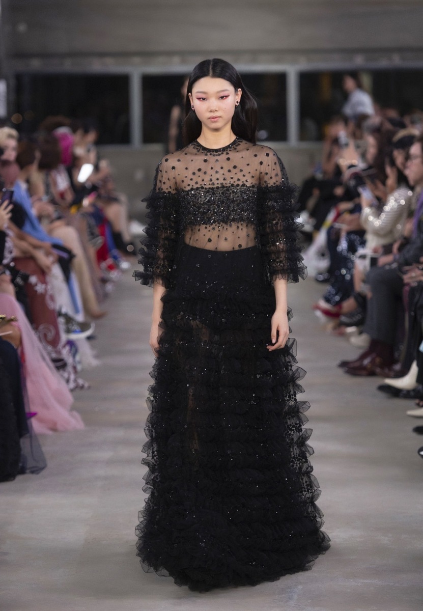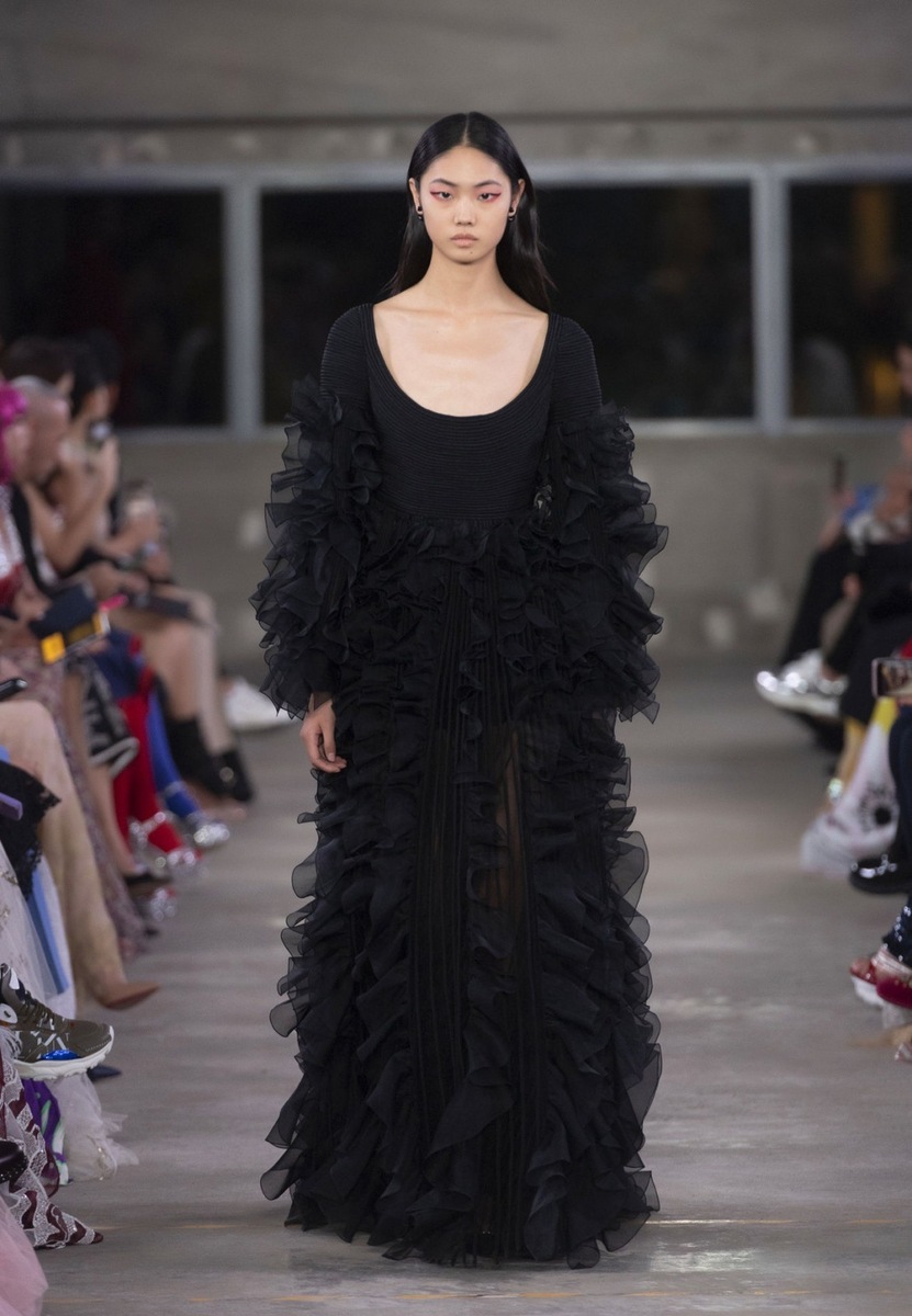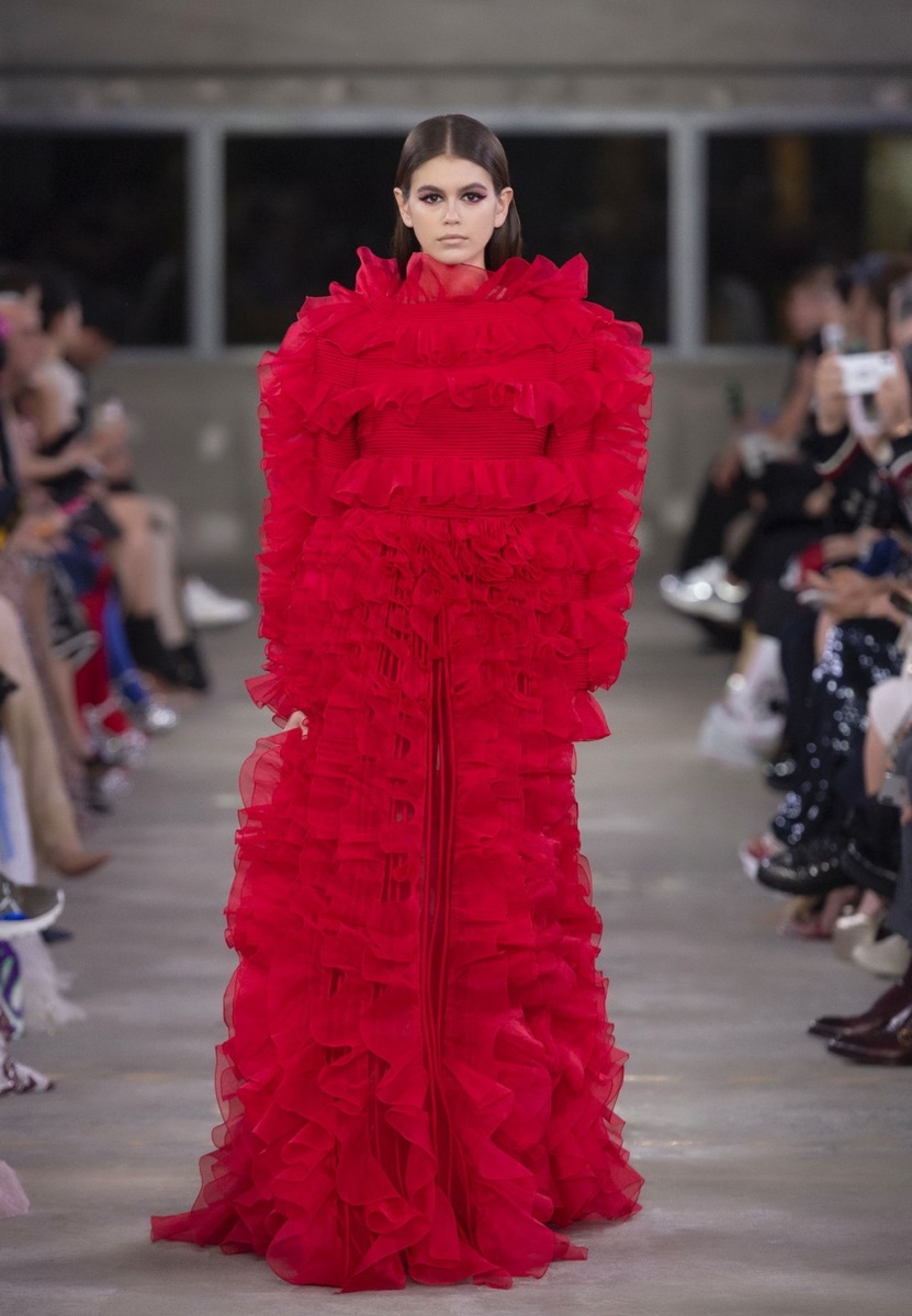 One of the main stars of the fashion show was daughter of Cindy Crawford, Model Kai Gerber, who is present to nearly any notable fashion show. Which of the outfits from the Pre Fall 2018 collection took the fancy of our editors? The luxury black dress with a smooth top and a deep round neckline created in combination with a richly ruched skirt - perfect drama, wow!