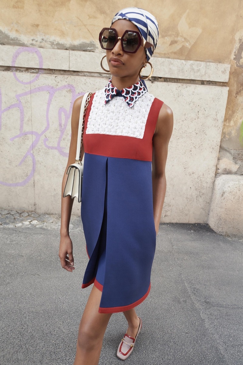 The Resort 2019 collection is dominated by various types of delicate silk scarves which you can wear on your neck, head or simply as an embellishment or accessory on your luxury handbag. You can’t miss the giant sunglasses on every model, which are massively on trend. The varied shapes, colours and sizes make it clear that this is a key accessory. The items in the collection give way to our fantasy with many abstract motifs, allowing everybody to pursue different characteristics in the clothing. My favourites are the garments with the Valentino logo. Like many other fashion and trend lovers, I have fallen for brands and this collection fits in perfectly. Although the clothing has writing all over it, it still maintains an elegant style.