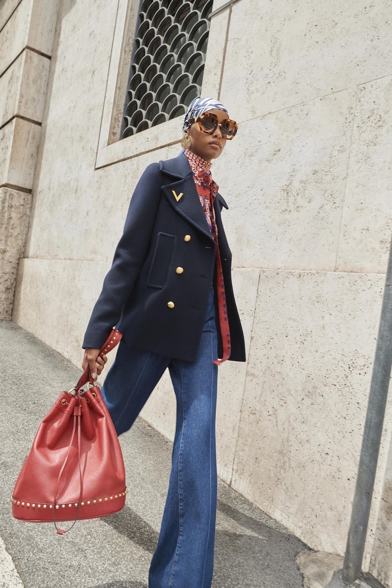 I have to say from the outset that it was exceedingly difficult to choose three top models, because the collection is gorgeous from the start to the finish. In top place is the cream mini dress which is tailored like a trench coat. A scarf on the head and giant sunglasses… absolutely timeless perfection. In short, a model you can travel in time with and always be IN. My second choice is the striped dress, denim bellbottoms and the blue poncho with the Valentino logo. Ponchos are finally making a comeback and their wearability knows no bounds. Surprised by a cold wind or light rain while strolling around town? Sure… that’s what a poncho is for! And finally, I can’t omit the adorable light blue lace maxi dress. It’s made for a princess yet is wearable in the daytime. Wandering through the city with a refreshing ice cream in hand, then a glass of champagne on the street… hmmm…