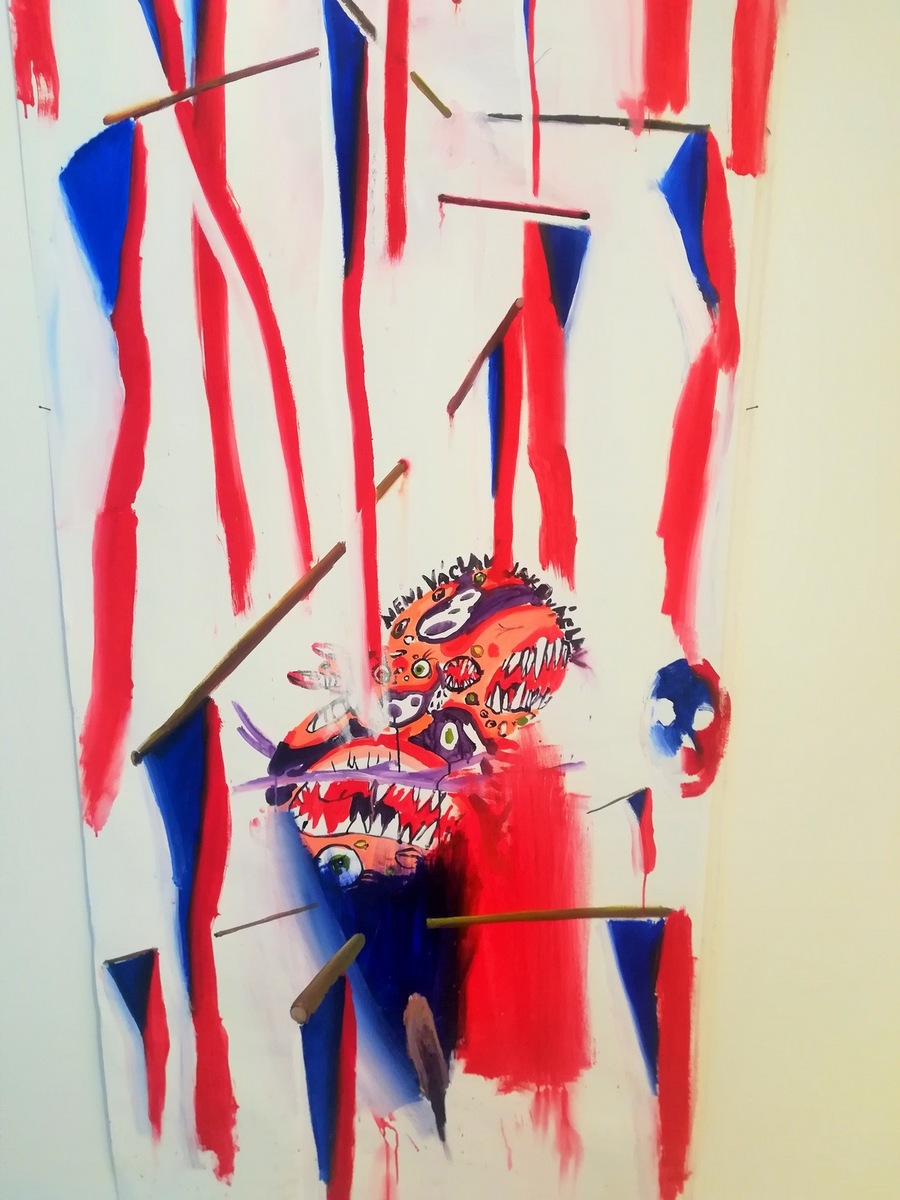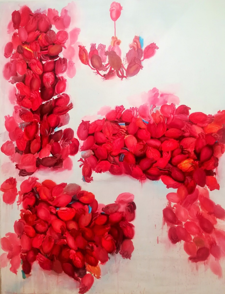 The paintings in the Burning Heart exhibition relate, according to Jiří Petrbok, to any totalitarian regime throughout the world. In his paintings we can see irony and sarcasm, but as the curator Otto M. Urban noted, this is a multi-layered work, where the outer film of irony conceals serious topics.